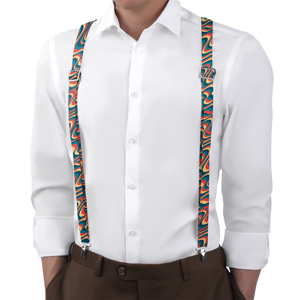 Customize designs or solid colors with over 500 colors available. Vegan leather Y-back design allows for flexibility with movement and complements the vibrant print of our recycled fabric. Choose from 6 adjustable lengths. We also make custom suspenders.