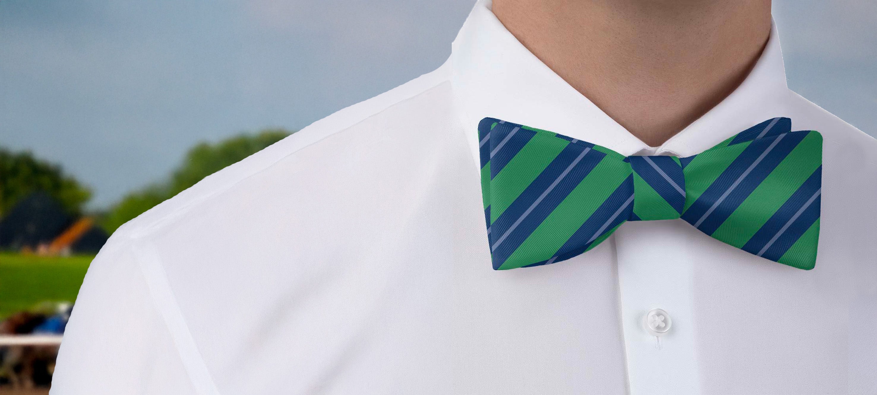 Green and blue striped bow tie on a white shirt with a blurred outdoor background