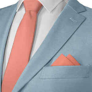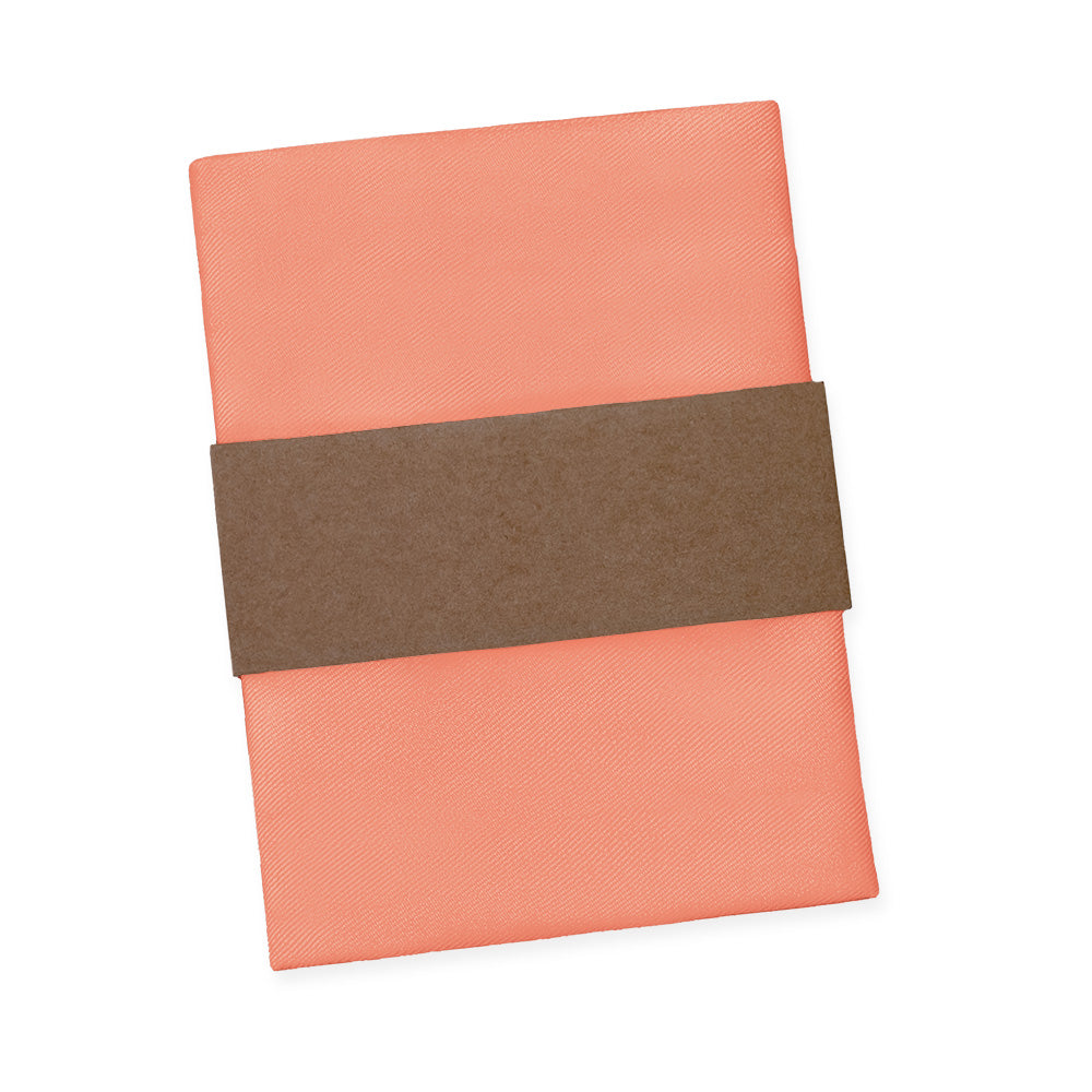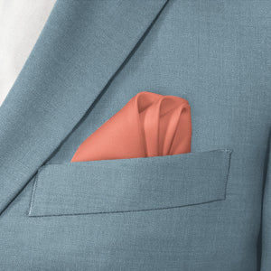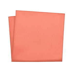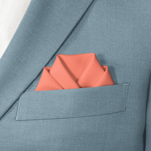 Fresh and energetic solid coral pocket squares symbolize good luck and positivity, like these ones matched to Azazie Mai Tai.