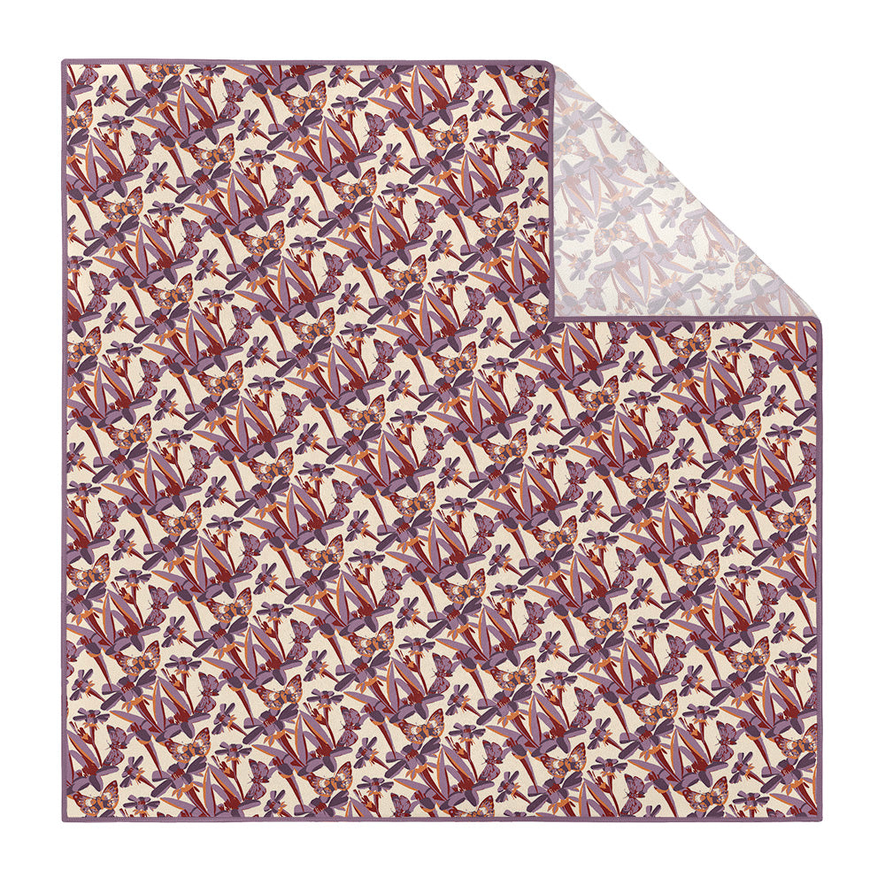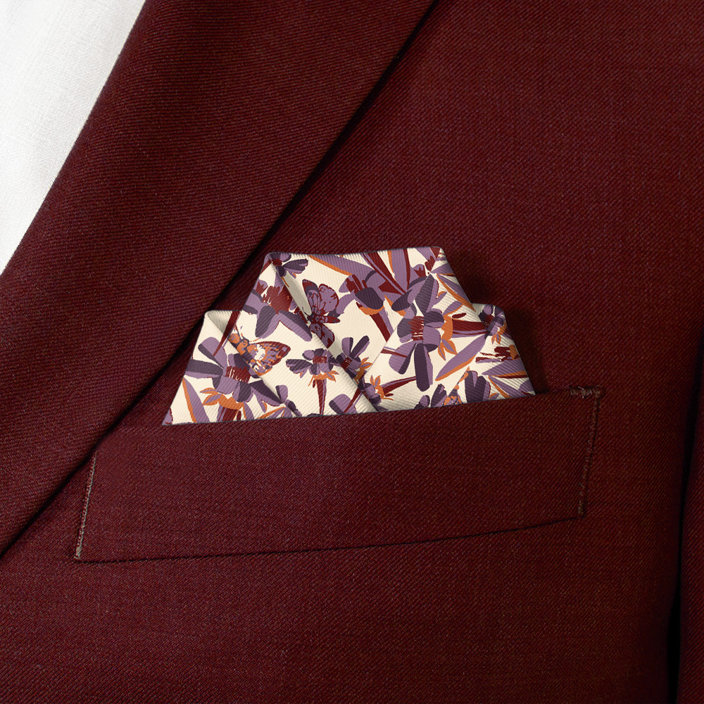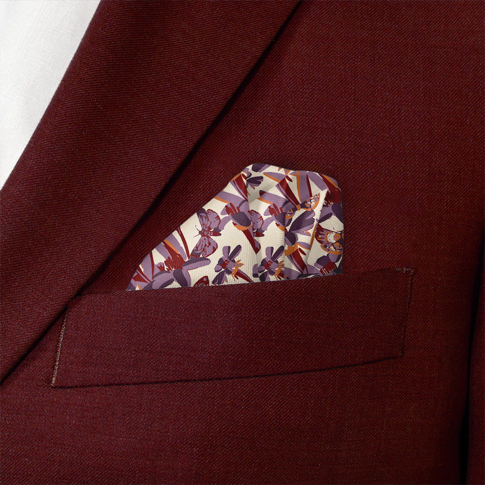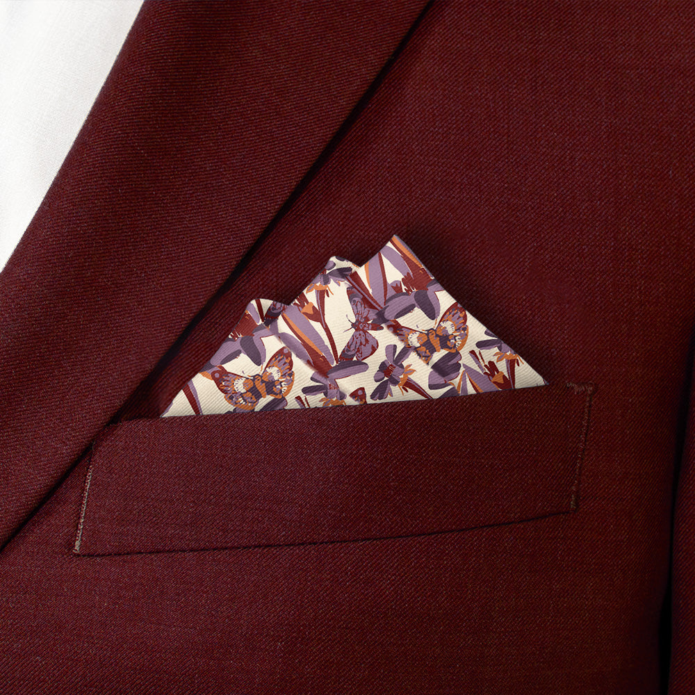 This fluttery pocket square pattern features butterflies landing on fields of florals. Equal parts delicate and strong, this versatile abstract design fits many themes and occasions.
