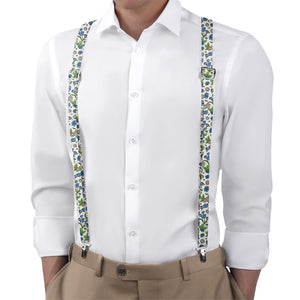 Printed fabric straps are 1-inch wide and secured to an elastic rear strap with vegan leather Y-back to allow the suspenders to move with you and extend as you bend. We use silver alligator pant clips that feature a special mechanism to ensure the suspenders clamp securely to pants.