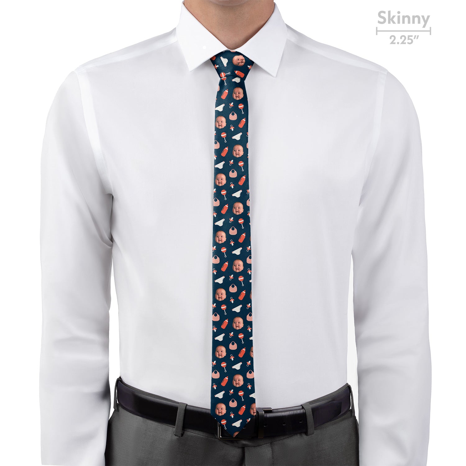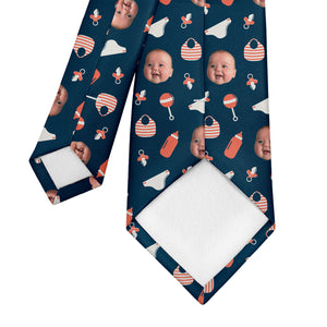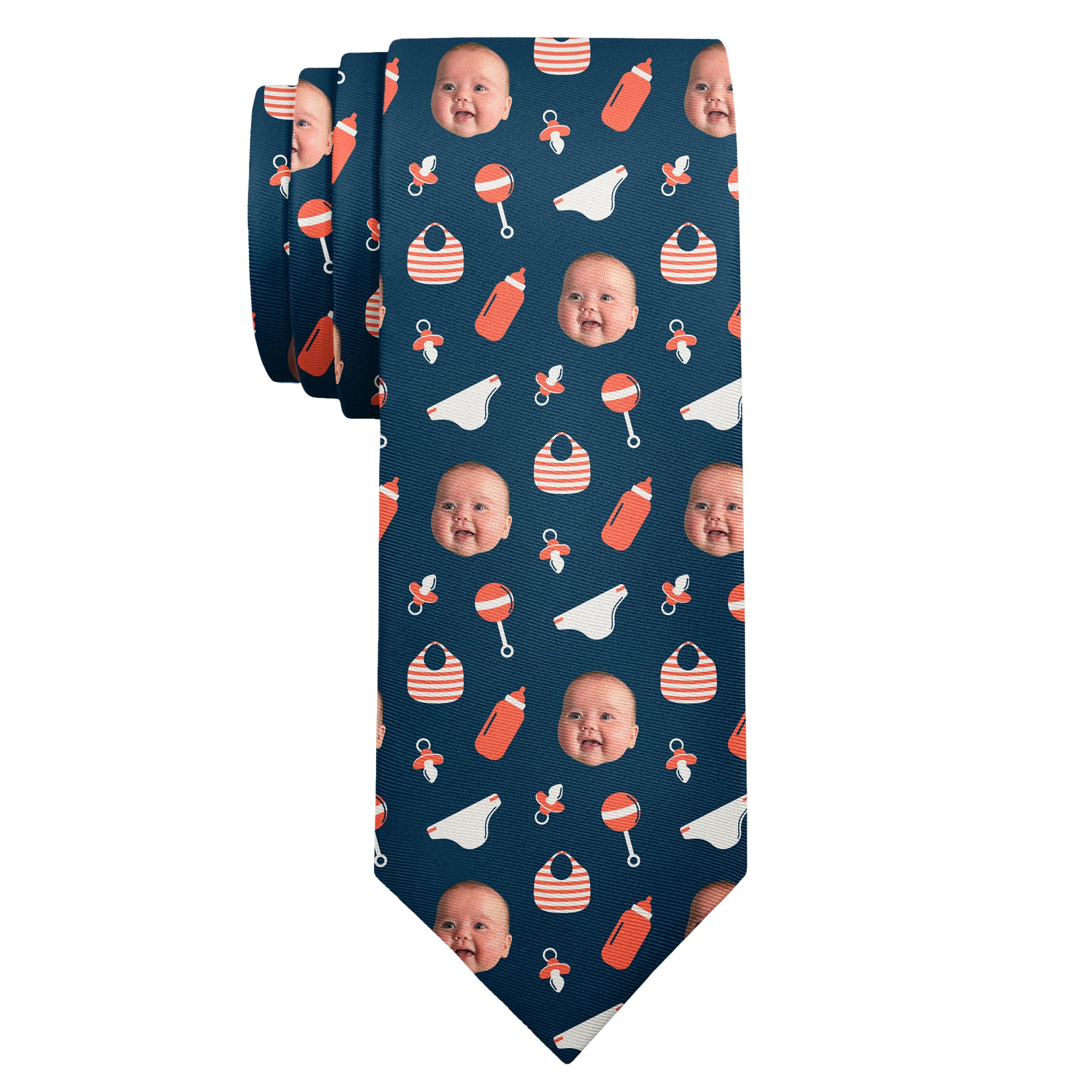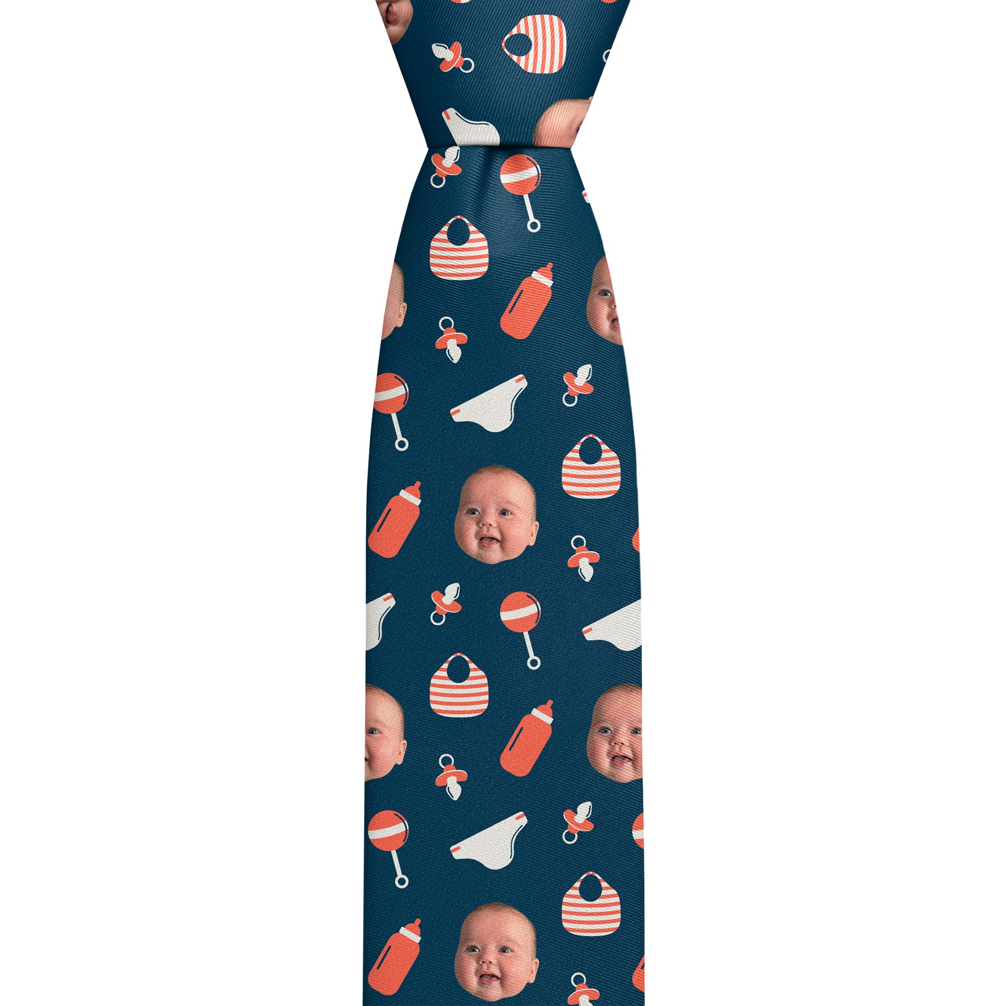 Commemorate and celebrate the joy of bringing a new life into the world with our Baby Fever Custom Photo Tie! This endearing baby-themed pattern cradles your baby’s photo amongst a sprinkling of rattles, bibs, pacifiers, and diapers. Whether you have one baby, twins or even triplets, we can incorporate your little one’s photos into this repeating three-color pattern. To ensure the best results, we recommend using up-close photos of your baby's face as those types of photos will work well with this pattern. Change the colors of the icons and background to create your own look - whether you like the customary pinks and blues or a color combination totally unique to you and your baby. Our soft fabric and high-quality printing make for durable ties that will remain fade-free and brilliant into the future.