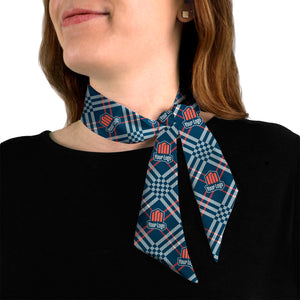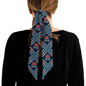 Traditional and intricate, the Cincy 2 Custom Logo Hair Scarf helps you create a bold statement for your brand or organization. While plaid patterns date back over 300 years, they still feel contemporary and fashionable today. Your logo is repeated within the diamonds of the plaid pattern, showcasing it over the entire length and width of this skinny scarf. Popular with those in healthcare, education, construction, and finance, this scarf is versatile enough to fit a variety of industries and occasions. Putting people and planet first, our hair scarves are made by skilled resettled refugees using high quality recycled stretch poplin fabric. Our recycled poplin fabric balances softness and structure and can be totally customized through our advanced dye sublimation printing techniques.