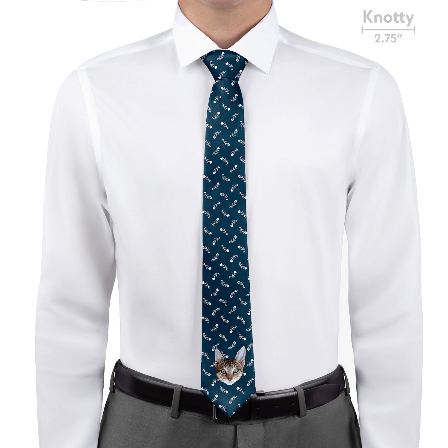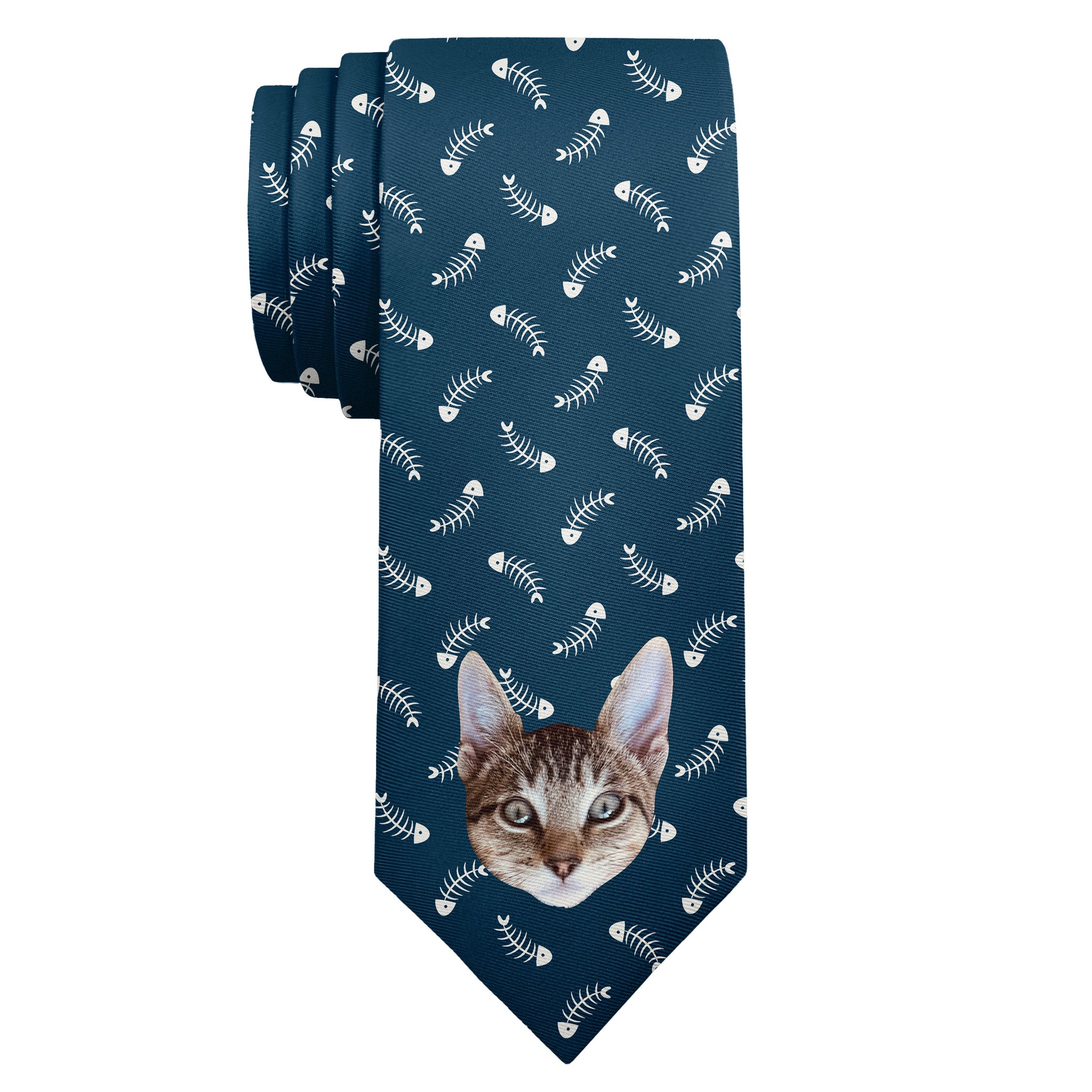 Celebrate your cat’s natural hunting prowess with this cheeky take on a cat necktie. The Fish Bone Custom Photo Necktie features a repeating fishbone pattern and your cat’s photo placed centered once on the widest part of the tie. This two-color pattern is versatile, allowing you to customize the colors and showcase a clear photo of your cat’s face, a shot of their full body, or a group photo of multiple cats. Our ties are made with silky soft recycled fabric and advanced printing techniques allowing for the design to fully wrap around to the back of the tie. High-quality craftsmanship meets quirky style makes our Fish Bone photo tie perfect for one-of-a-kind gift for cat lovers in your life.