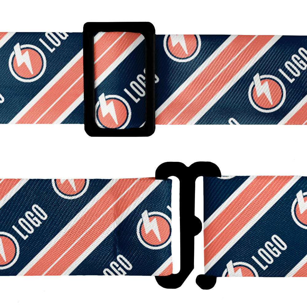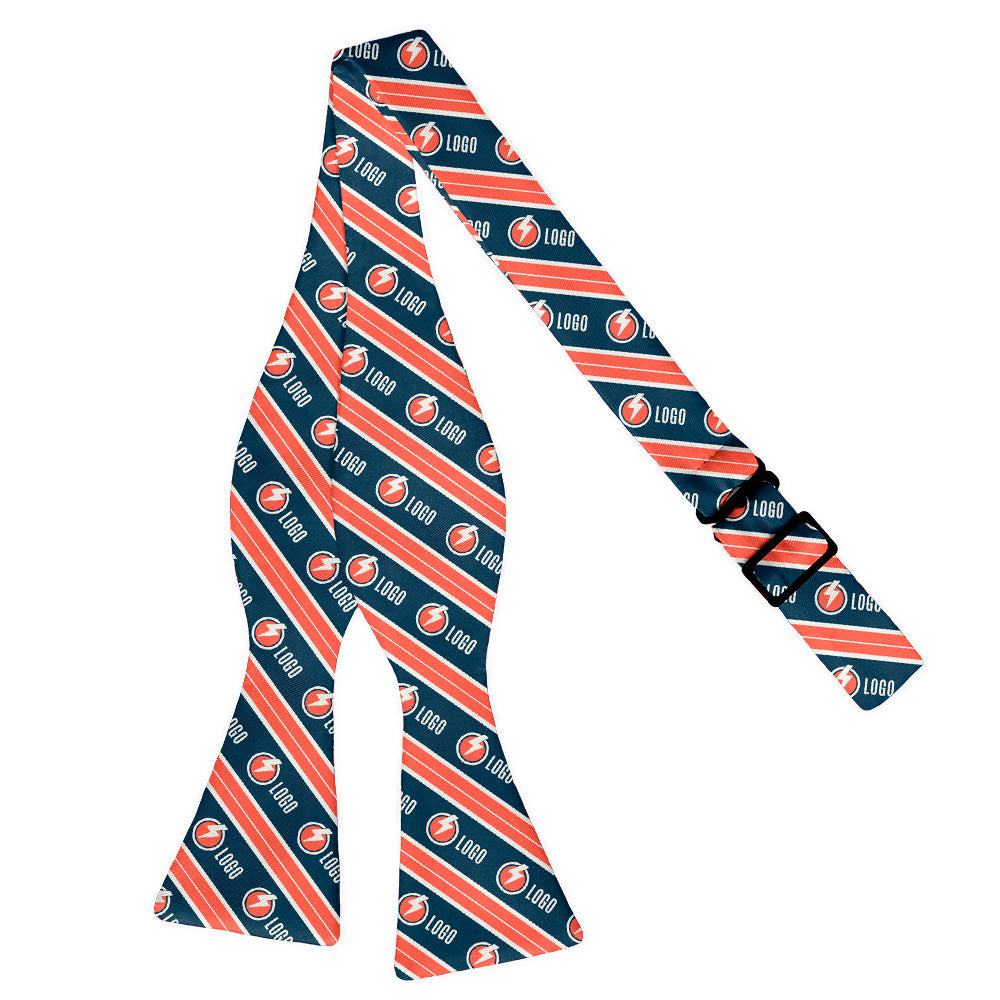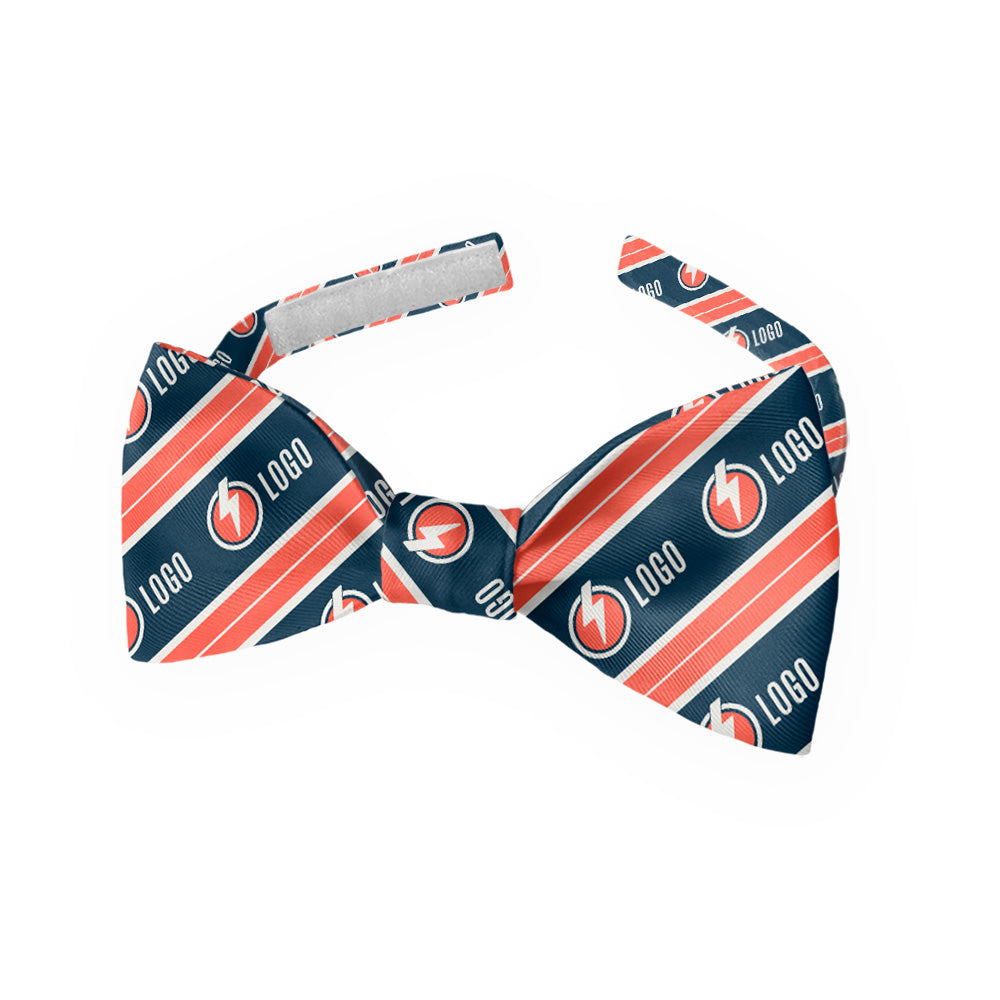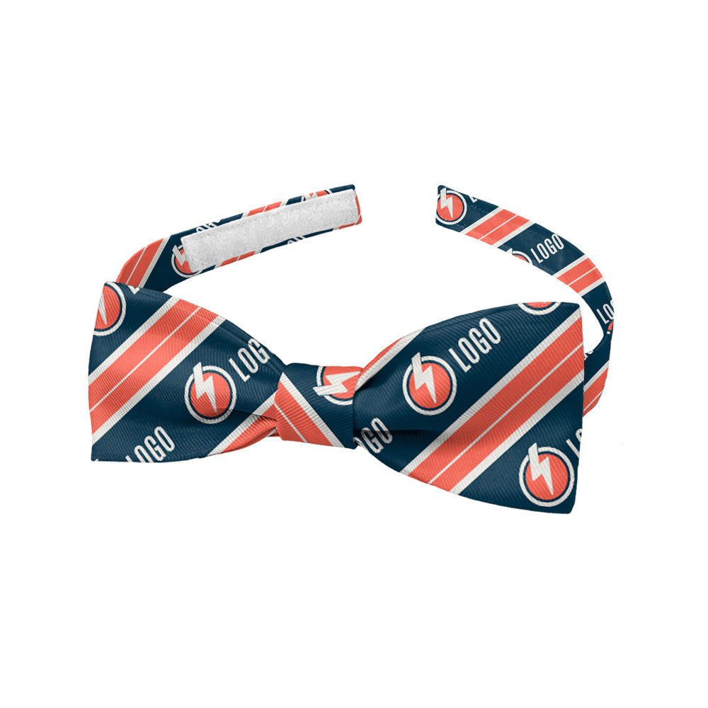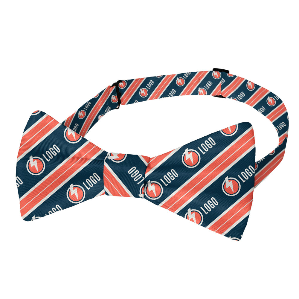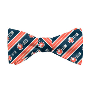 Featuring a repeating logo pattern and a classic stripe design, the Kalamath 2 Custom Logo Bow Tie is the best of both worlds combined into one sharp and stylish accessory. This pattern features four stripes, each a different width, and each customizable in colors that match or highlight your branding. Your logo will be featured within the widest 0.7-inch diagonal stripe, and then repeated all over the bow tie. While this pattern works best for simpler logos due to the smaller scale of the logo placement, our advanced dye sublimation printing will provide the clearest and cleanest print quality with the sharpest clarity possible. Our bow ties are durable for daily use, yet luxurious enough to make a high quality special gift, and our fade and wear resistant fabric is soft and supple to the touch. Most popular with schools or universities, the Kalamath 2 Custom Logo Bow Tie pattern is timeless and works well with many types of organization or industries.