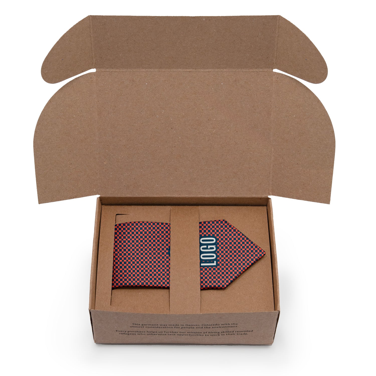 The Norman 1 Custom Logo Necktie offers a precise geometric pattern for a professional and subtle look. Perfect for professionals in finance, engineering, law, or any business that can appreciate an orderly geometric design made up of small scale squares and rectangles. This design can be customized in two colors that represent your brand and showcases your logo once in the center of the tie near the tip. Simple enough for everyday wear, but versatile for special occasions and gifting, our ties are printed using high quality dye-sublimation techniques to deliver meticulous results on our durable recycled twill fabric.