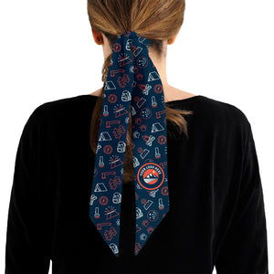 Show your adventurous side with our Outdoors 1 Custom Logo Hair Scarf. Perfect for those in environmental groups, nature organizations, or playful brands that appreciate the great outdoors, this three-color pattern includes mountains, trees, tents, compasses, paw prints and other camping-related icons. Your logo is prominently single-placed near the end of the skinny scarf, parallel between the long edges. Versatile and fun, our hair scarves can be worn as a hair accessory, as a head band, around the neck or tied to a backpack. Customizable in your brand’s colors, this scarf allows you to showcase your brand’s outdoorsy identity without sacrificing style. Crafted from premium recycled stretch poplin fabric, this hair scarf not only feels luxurious and supple but also holds up to wear and fading.
