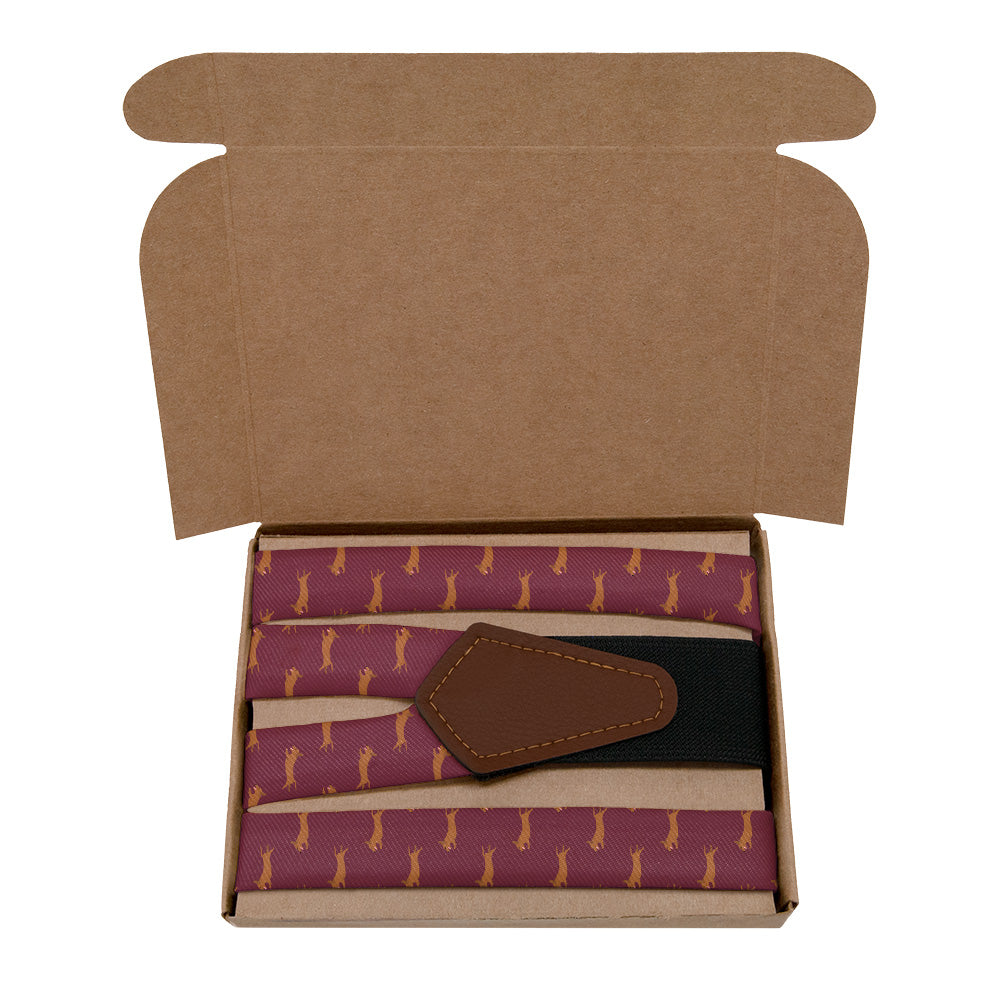 Bred for hunting burrowing animals, Dachshunds are known for their long bodies and short legs. The Dachshund suspenders highlight the beloved wiener dog's iconic profile.