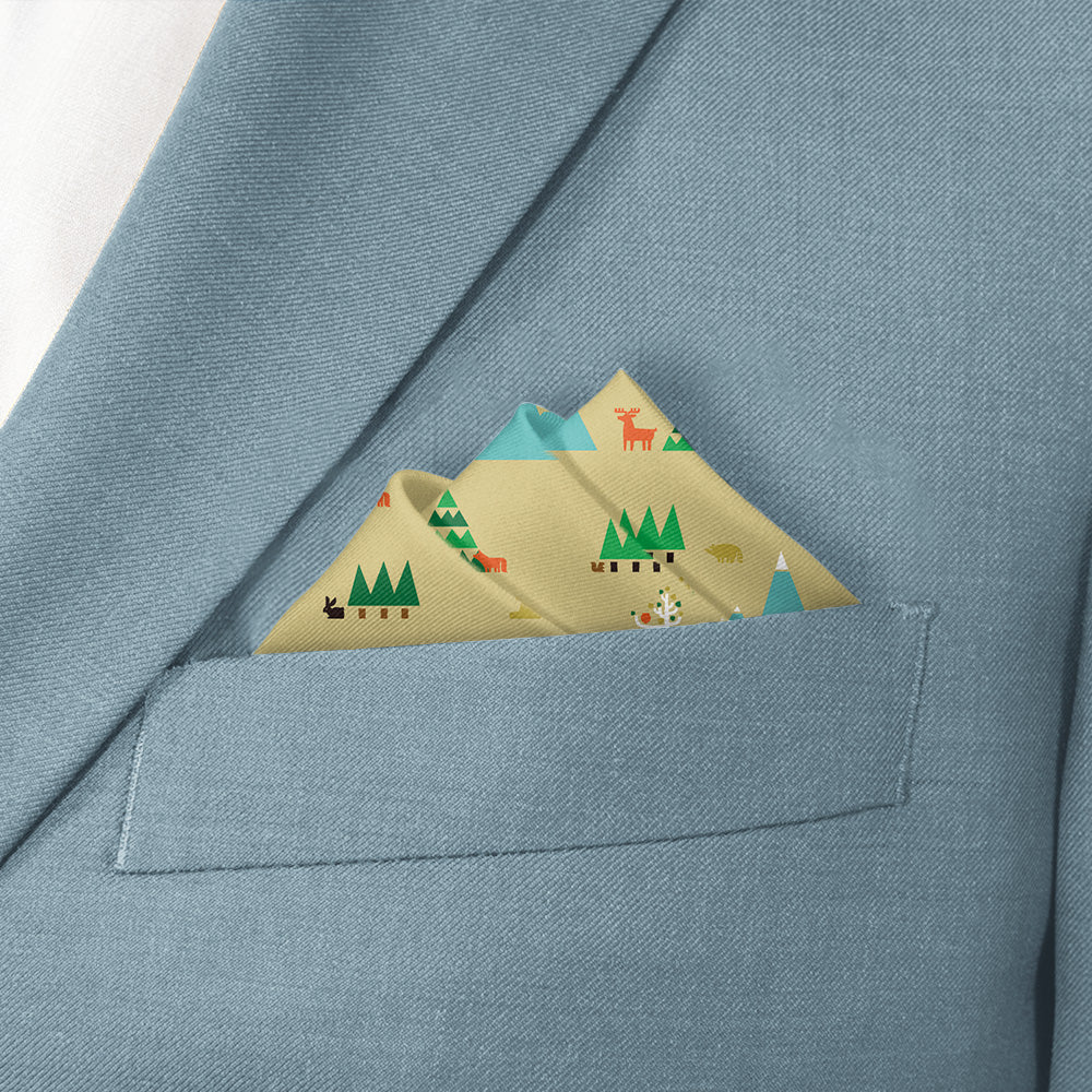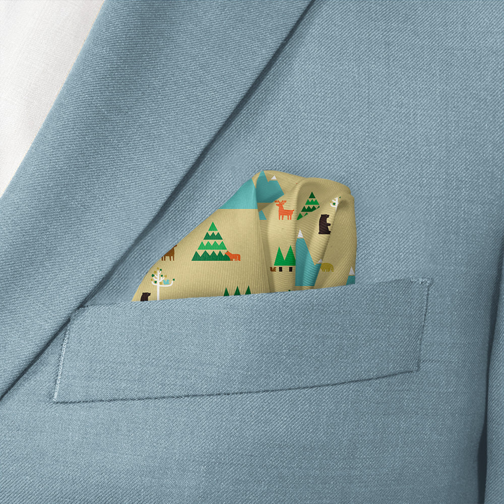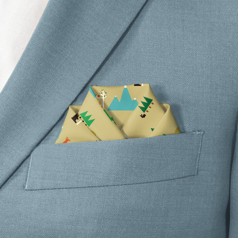 We print all our pocket squares on a recycled twill fabric made from plastic bottles that we have milled specifically for our products. We print our pocket squares on a single side and finish the edges with a fine purl edge. The back side of the pocket square will be unprinted.