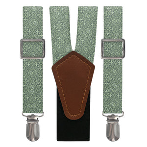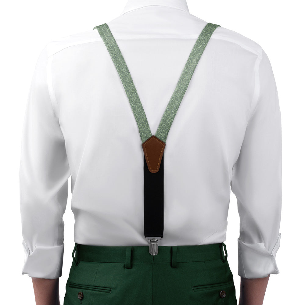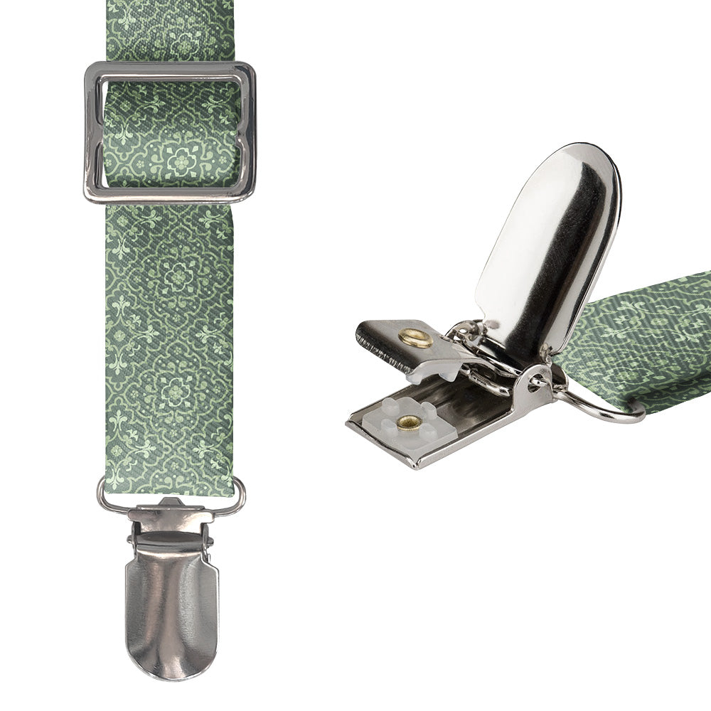 Printed fabric straps are 1-inch wide and secured to an elastic rear strap with vegan leather Y-back to allow the suspenders to move with you and extend as you bend. We use silver alligator pant clips that feature a special mechanism to ensure the suspenders clamp securely to pants.