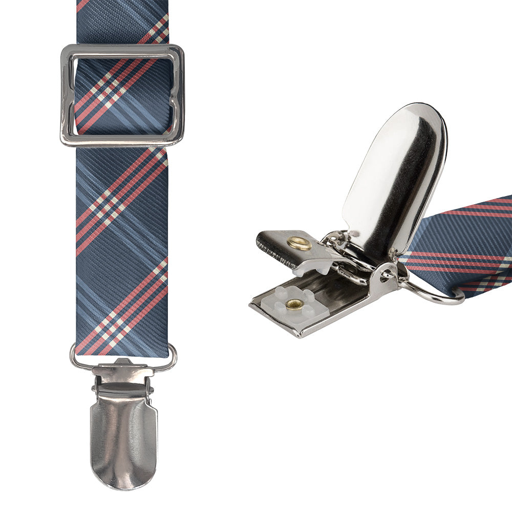 Printed fabric straps are 1-inch wide and secured to an elastic rear strap with vegan leather Y-back to allow the suspenders to move with you and extend as you bend. We use silver alligator pant clips that feature a special mechanism to ensure the suspenders clamp securely to pants.