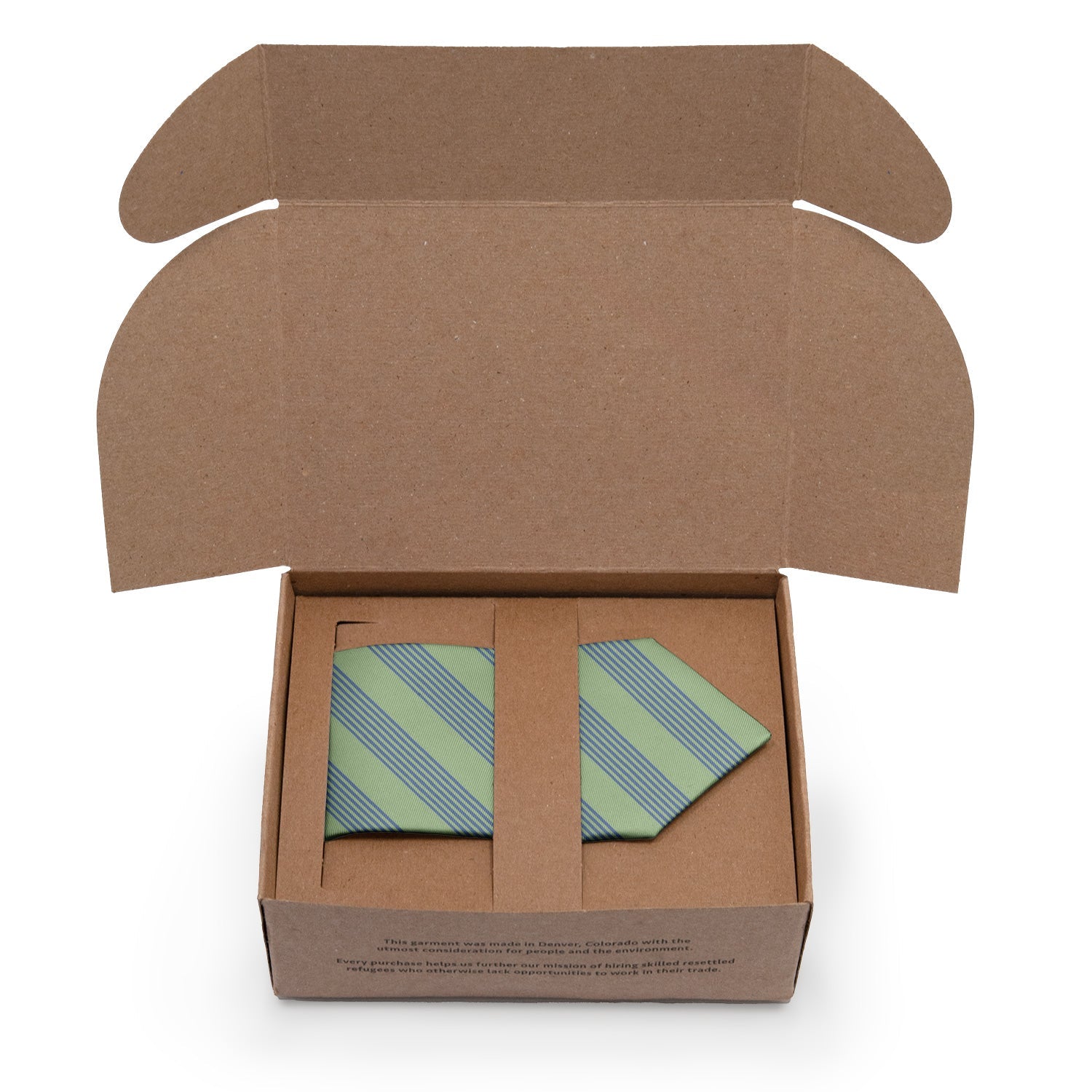 We print all our neckties on a high quality twill fabric made from recycled plastic bottles that we have milled specifically for our ties. Our recycled poly twill fabric has the soft sheen and feel of a semi-matte silk.