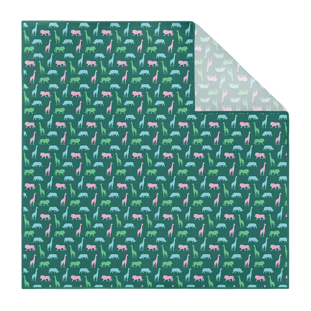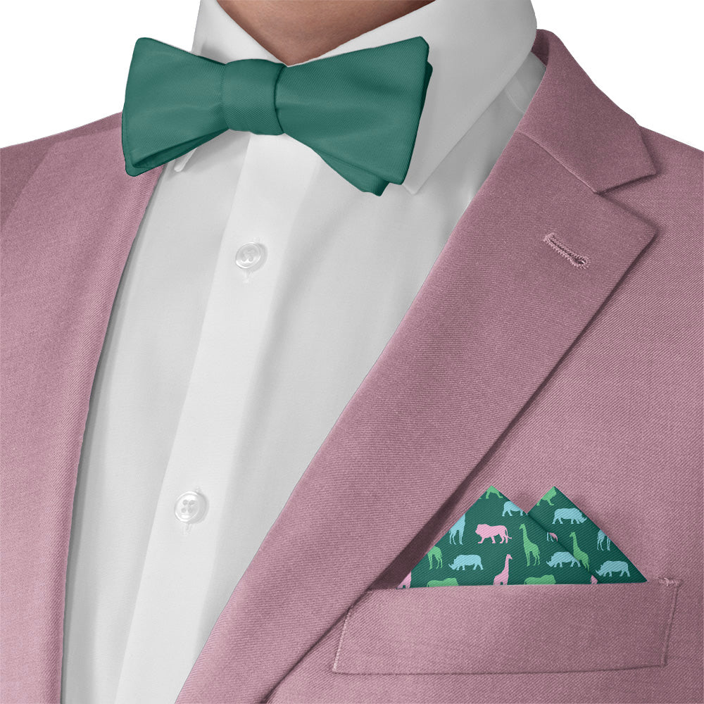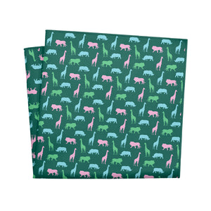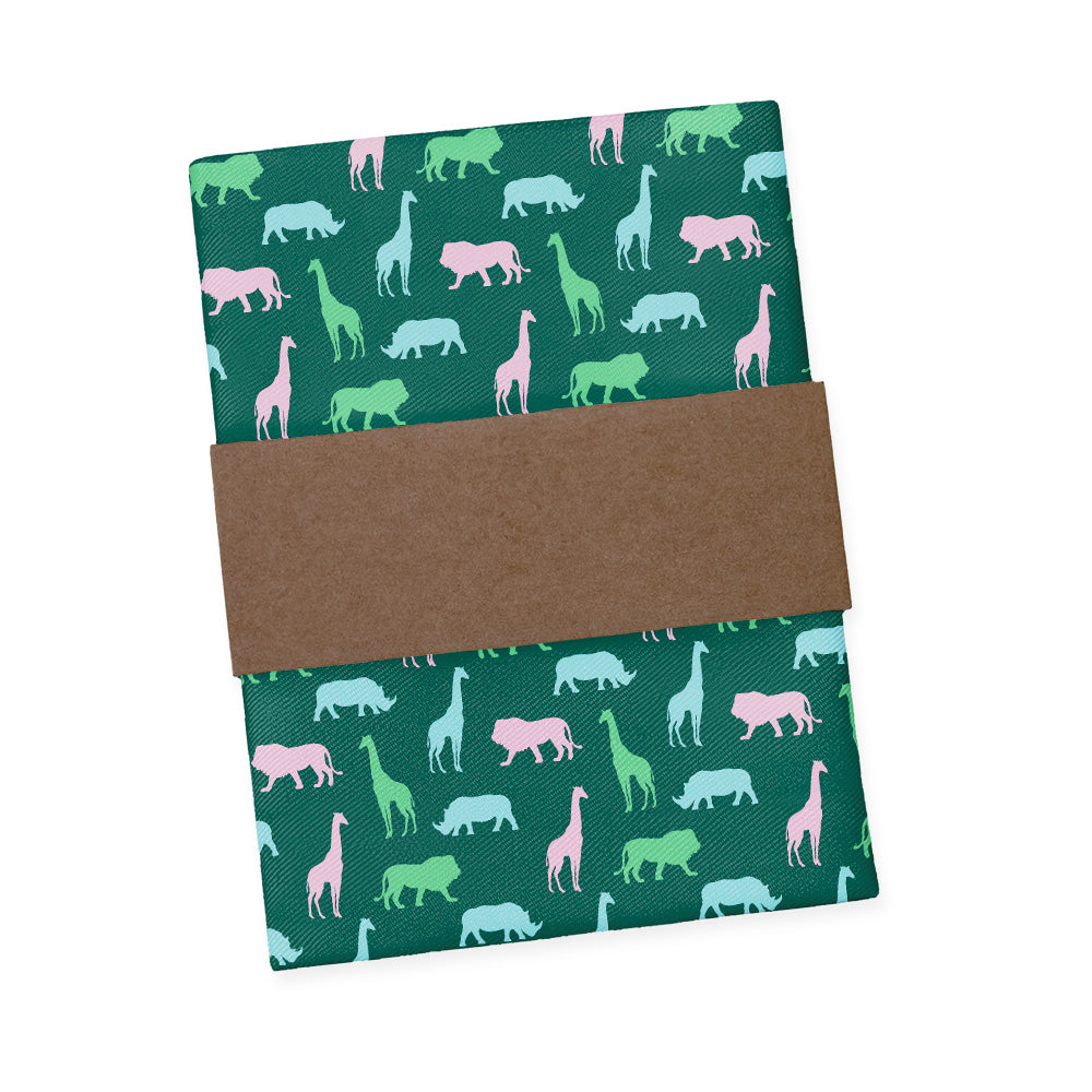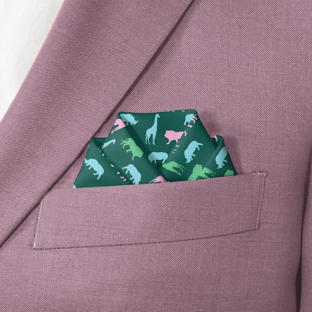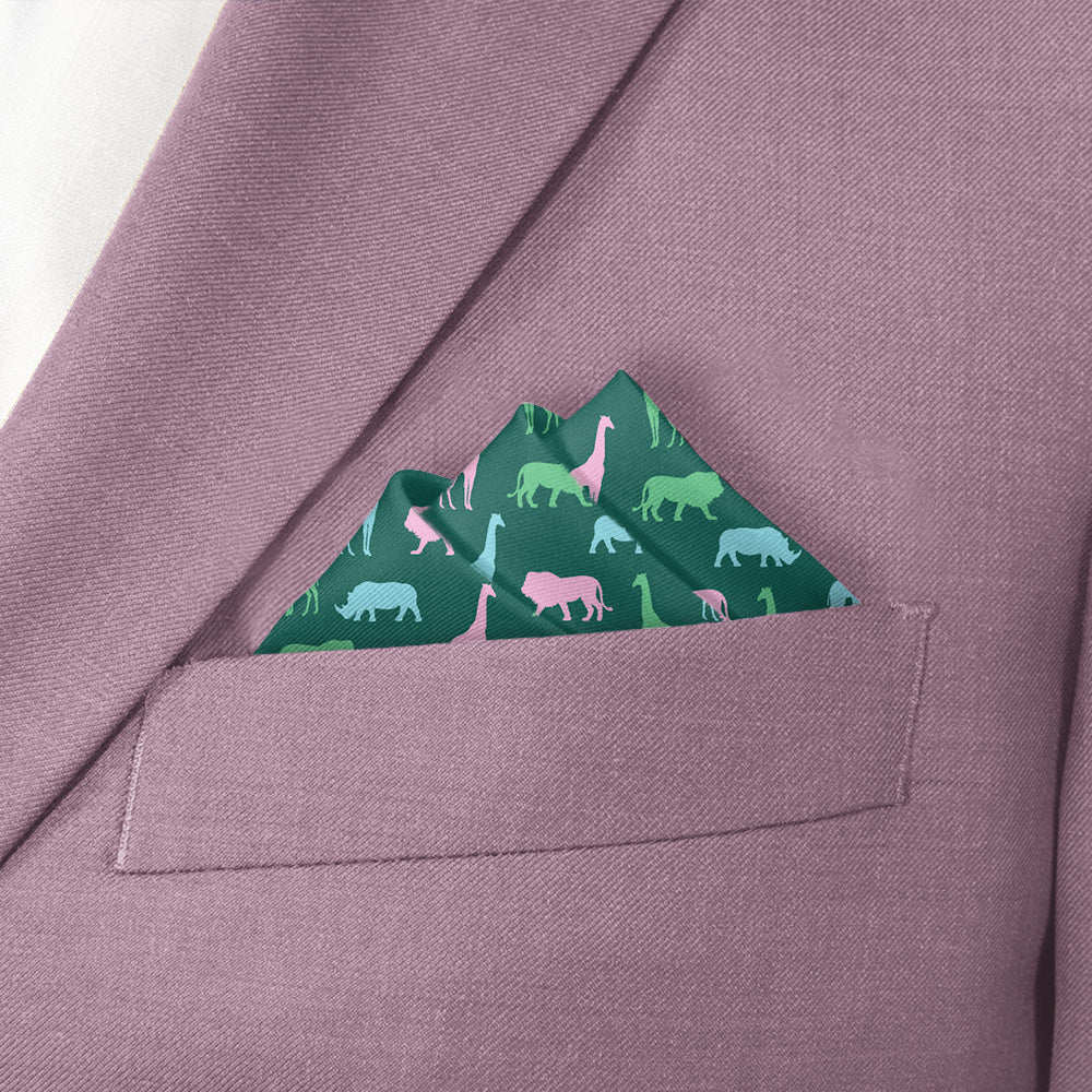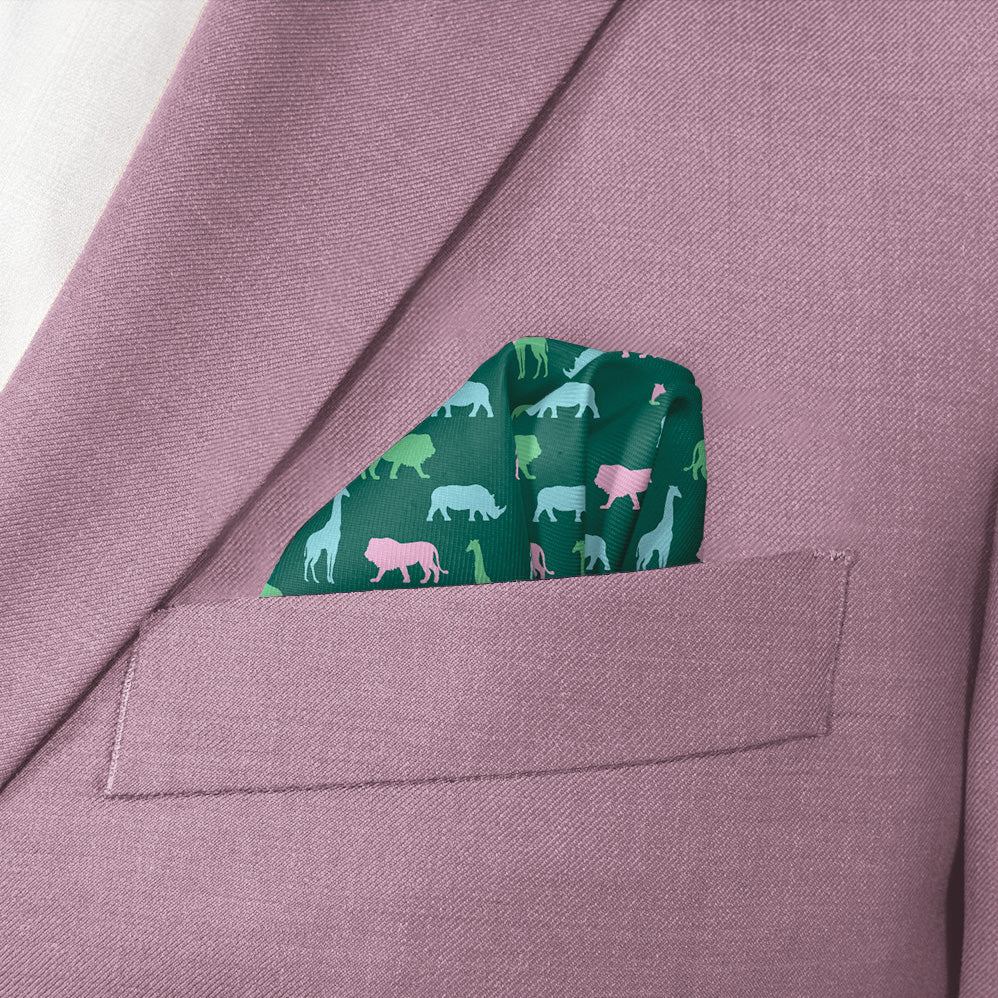 Walk on the wild side in this safari pocket square! This animal pocket square features colorful silhouettes of rhinos, lions, and giraffes for a fun, playful look. Wear the Safari square to the office, or pair it with a linen jacket for a more formal event.