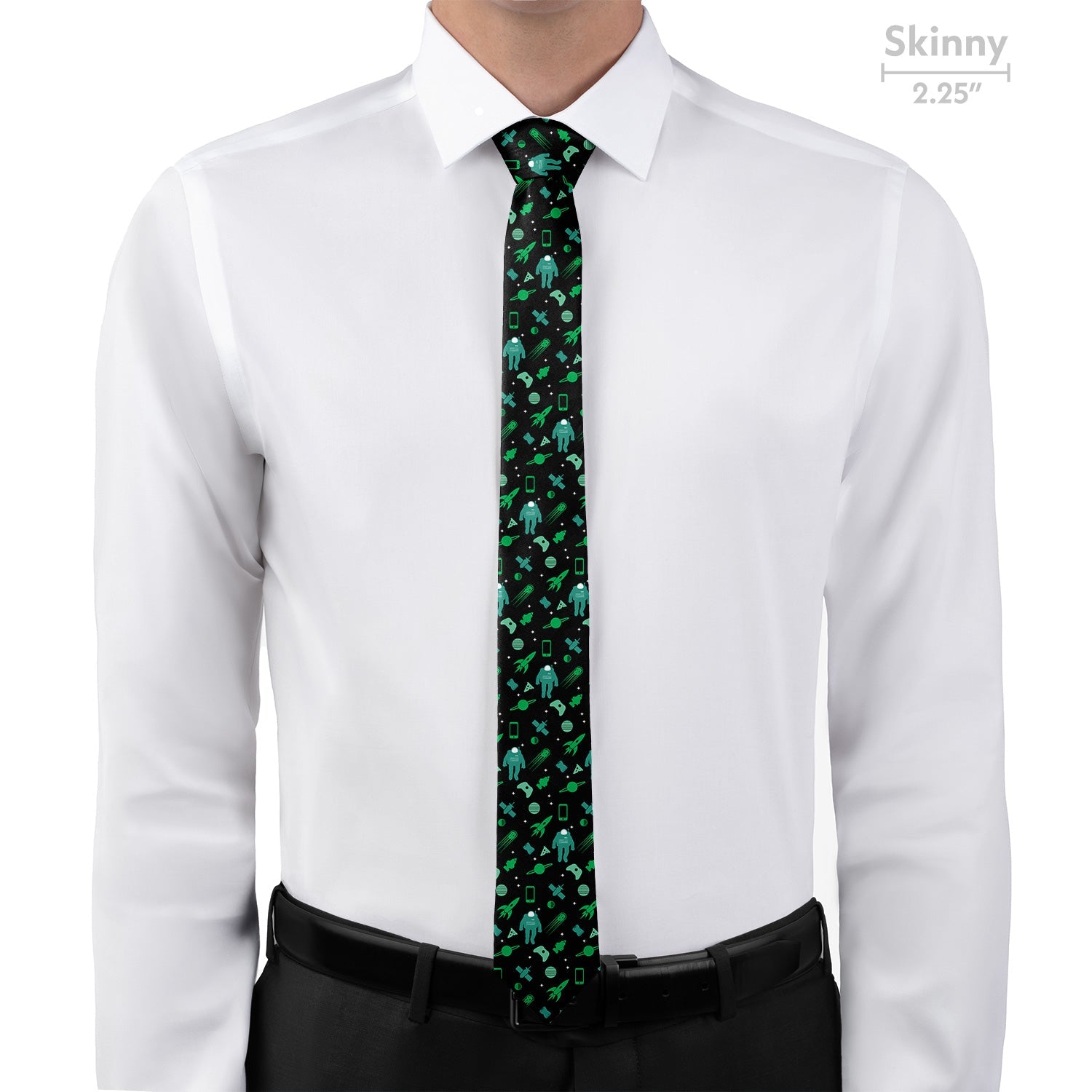Kids and adults alike love the bright and quirky outer space tie. The versatile colors on the Space Junk necktie pair easily with navy, black, or charcoal suits.