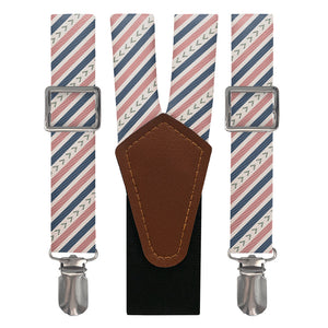 Printed fabric straps are 1-inch wide and secured to an elastic rear strap with vegan leather Y-back to allow the suspenders to move with you and extend as you bend. We use silver alligator pant clips that feature a special mechanism to ensure the suspenders clamp securely to pants.