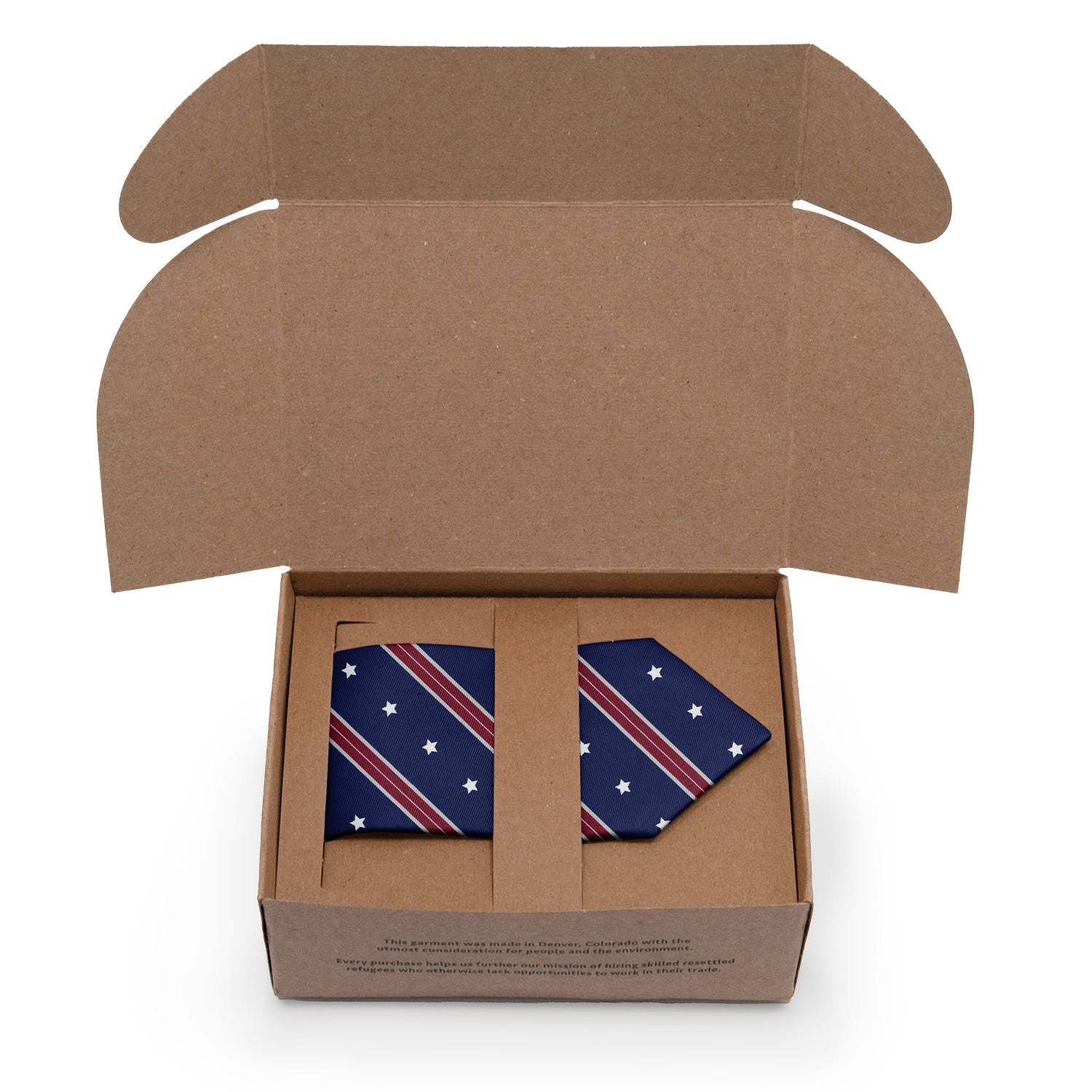 Proudly made in Colorado, our ties are helping to revitalize the textile industry in the United States. This patriotic tie lets you show your American pride while supporting fair wages and sustainable manufacturing. The Star Spangled necktie looks distinguished with any suit, or with a pale blue shirt.