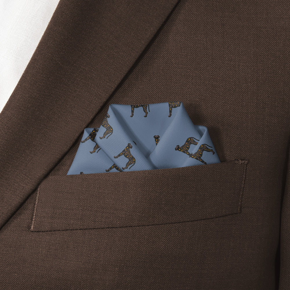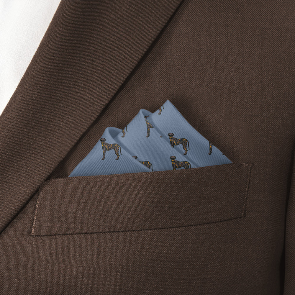 Named for their ability to hold game up a tree until a hunter arrives, Treeing Tennessee Brindles are energetic and loving hunting dogs. The Treeing Tennessee Brindle pocket square captures the distinctive coat of these popular hunting companions.