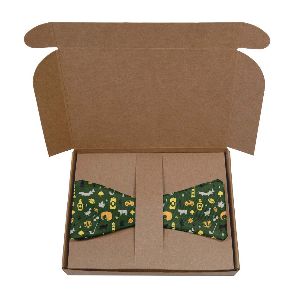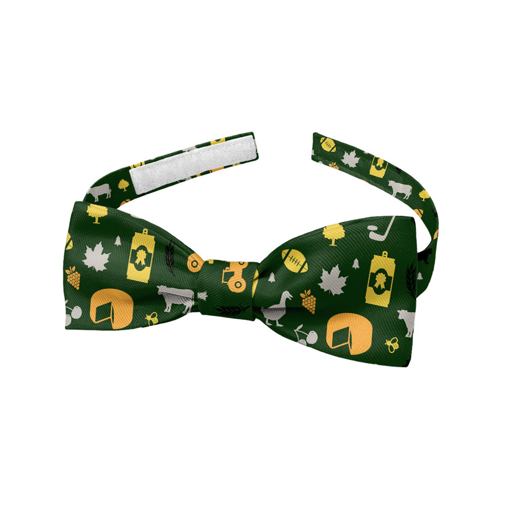 The Wisconsin State Heritage bow tie celebrates the culture of the Badger State. This bow tie highlights Wisconsin icons, such as hockey, tractors, beer, football, and (of course) cheese.