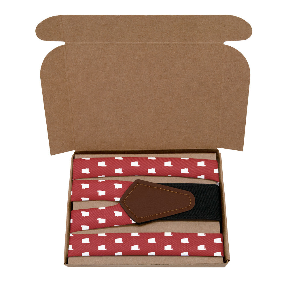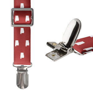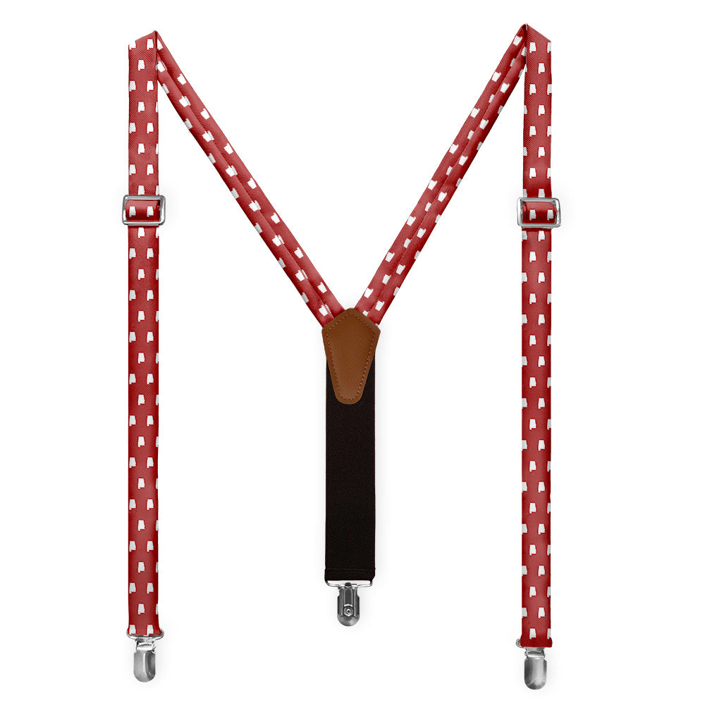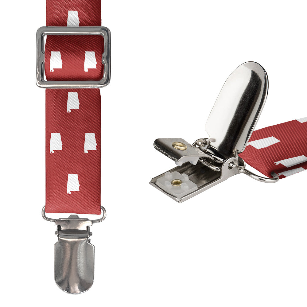 Honor your home state with the Alabama State Outline suspenders. A repeating motif of the Alabama state outline is the perfect way to show your love for the Yellowhammer State.