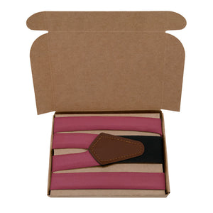 All suspenders are dry clean only. We recommend dry cleaners that don't use "perc" (perchloroethylene) solvents. Small spots may be gently dabbed with soapy water. If required, use an iron with a light touch on a synthetic setting only. Higher temperatures may result in color transfer or melting.