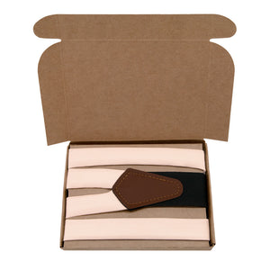 All suspenders are dry clean only. We recommend dry cleaners that don't use "perc" (perchloroethylene) solvents. Small spots may be gently dabbed with soapy water. If required, use an iron with a light touch on a synthetic setting only. Higher temperatures may result in color transfer or melting.