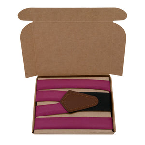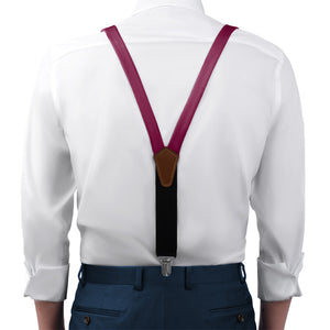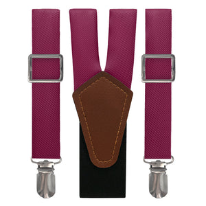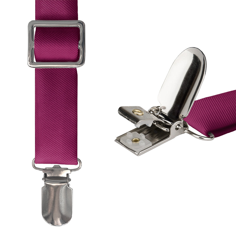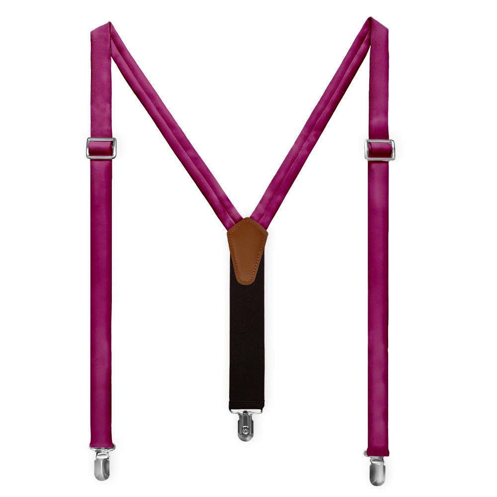 Berry colored suspenders pair joyful and romantic pink with sophisticated purple, like this brilliant solid shade matched to Azazie Raspberry.