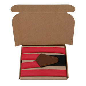 All suspenders are dry clean only. We recommend dry cleaners that don't use "perc" (perchloroethylene) solvents. Small spots may be gently dabbed with soapy water. If required, use an iron with a light touch on a synthetic setting only. Higher temperatures may result in color transfer or melting.