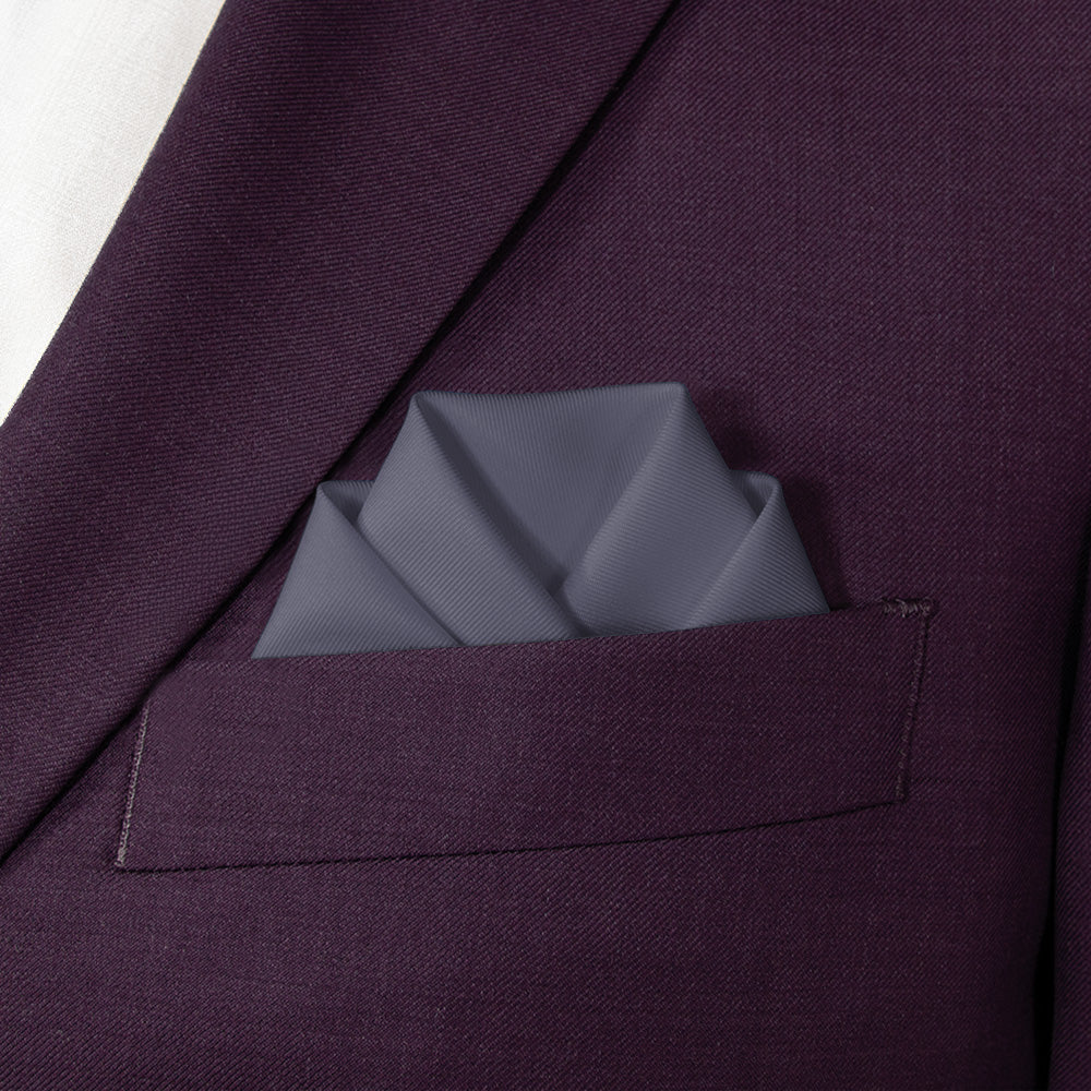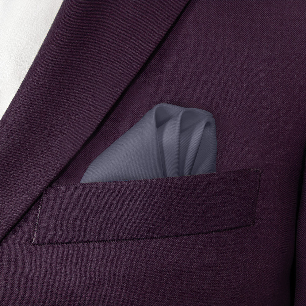 This solid dark gray pocket square matches Azazie Stormy, a dark bluish gray that conveys intensity and depth.
