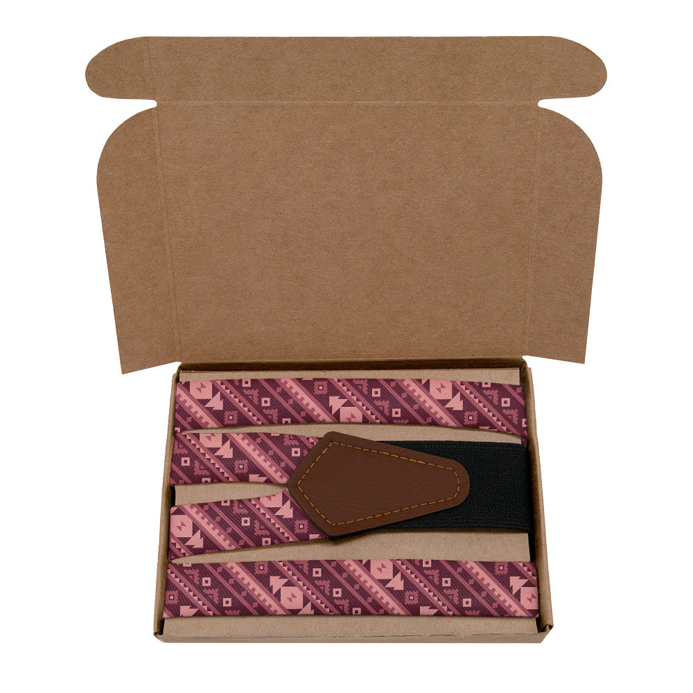 An ensemble of stripes, geometric shapes, and chevrons make up this tribal inspired print. Bring your outfit to life with the Azteca suspenders.