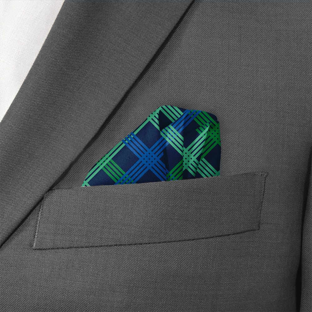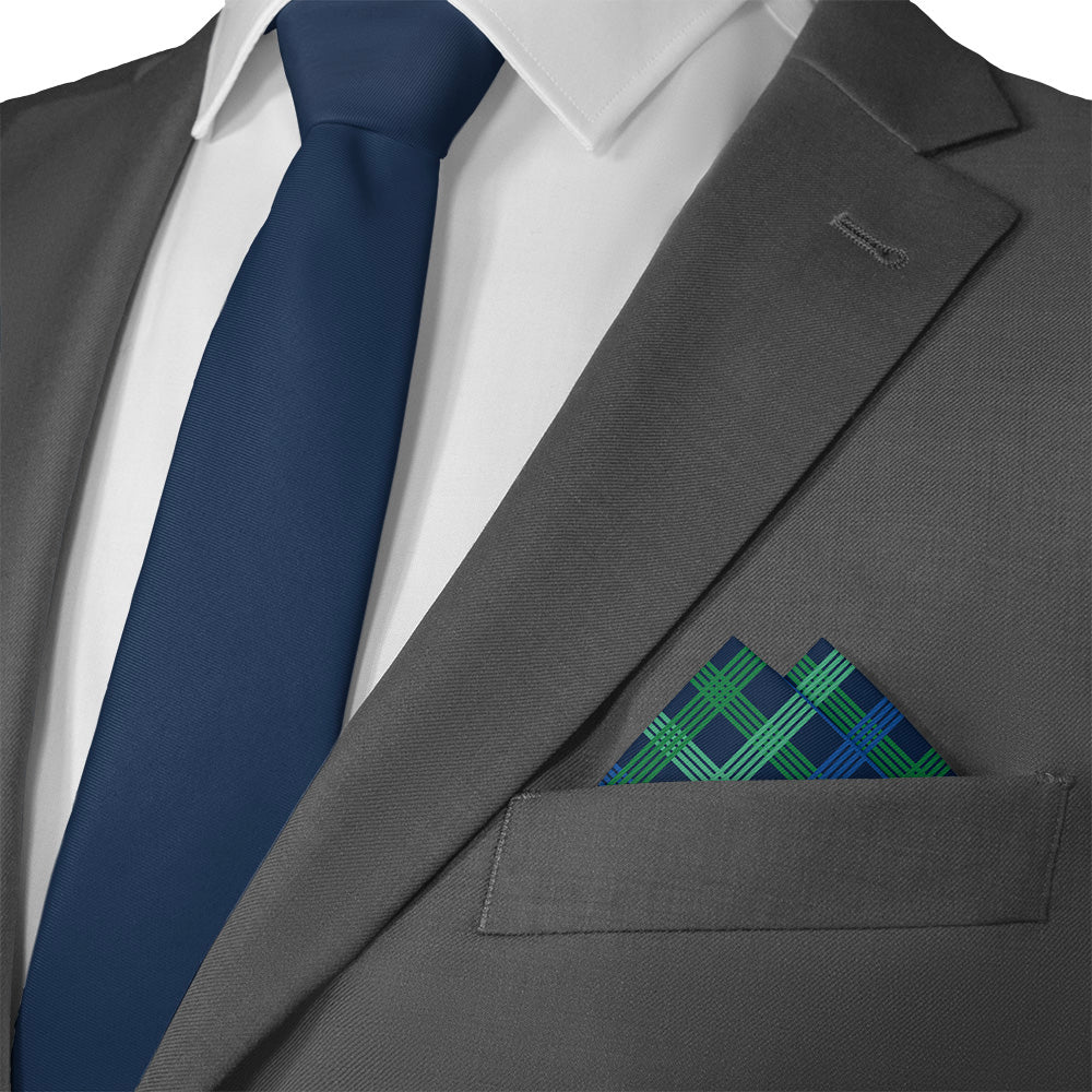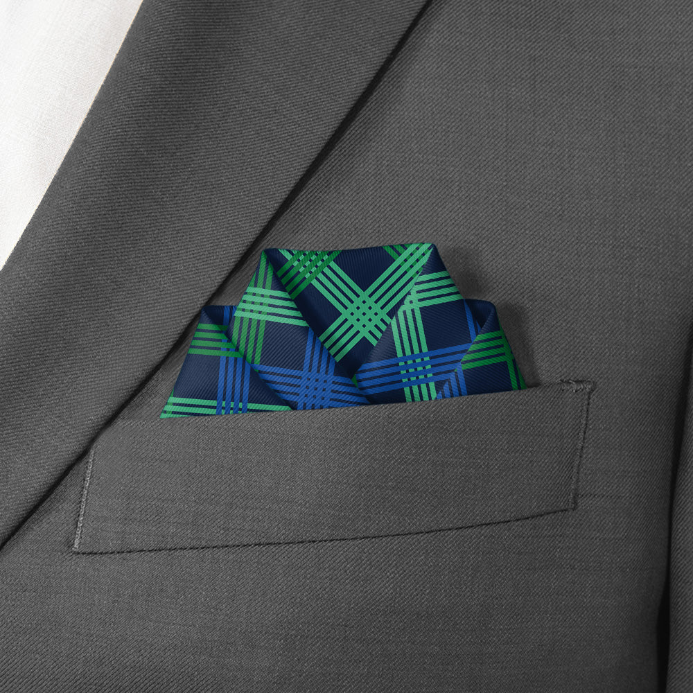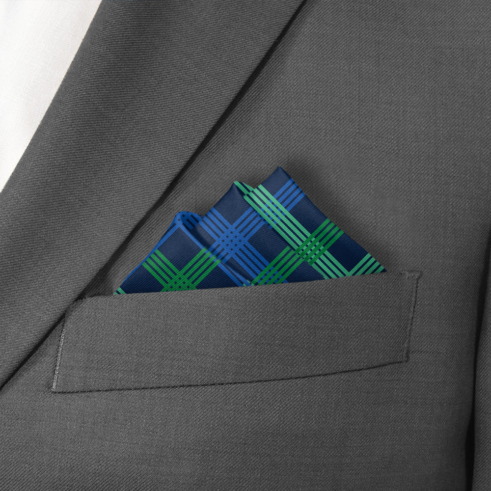 Worn without a tie, the Belmont Plaid pocket square adds a touch of casual sophistication to a navy suit.
