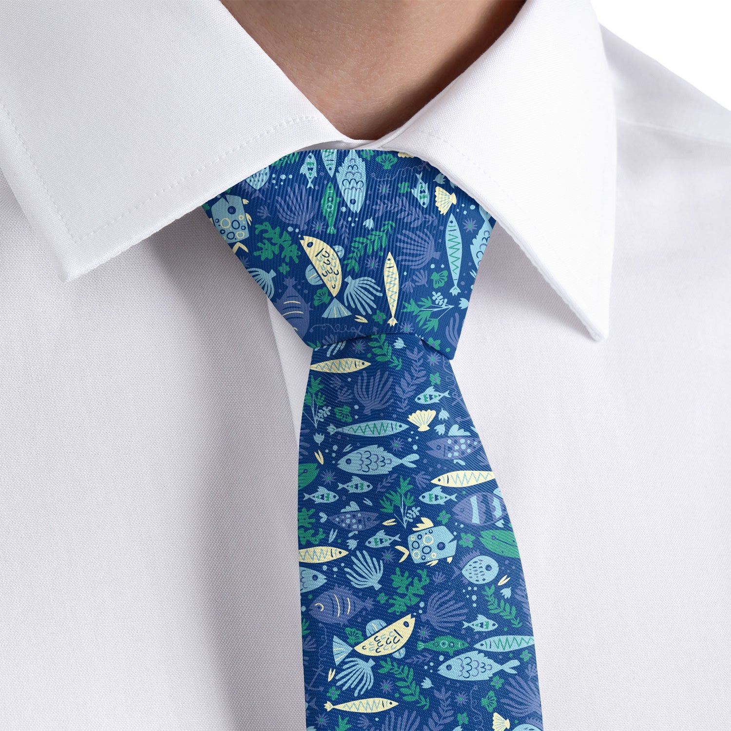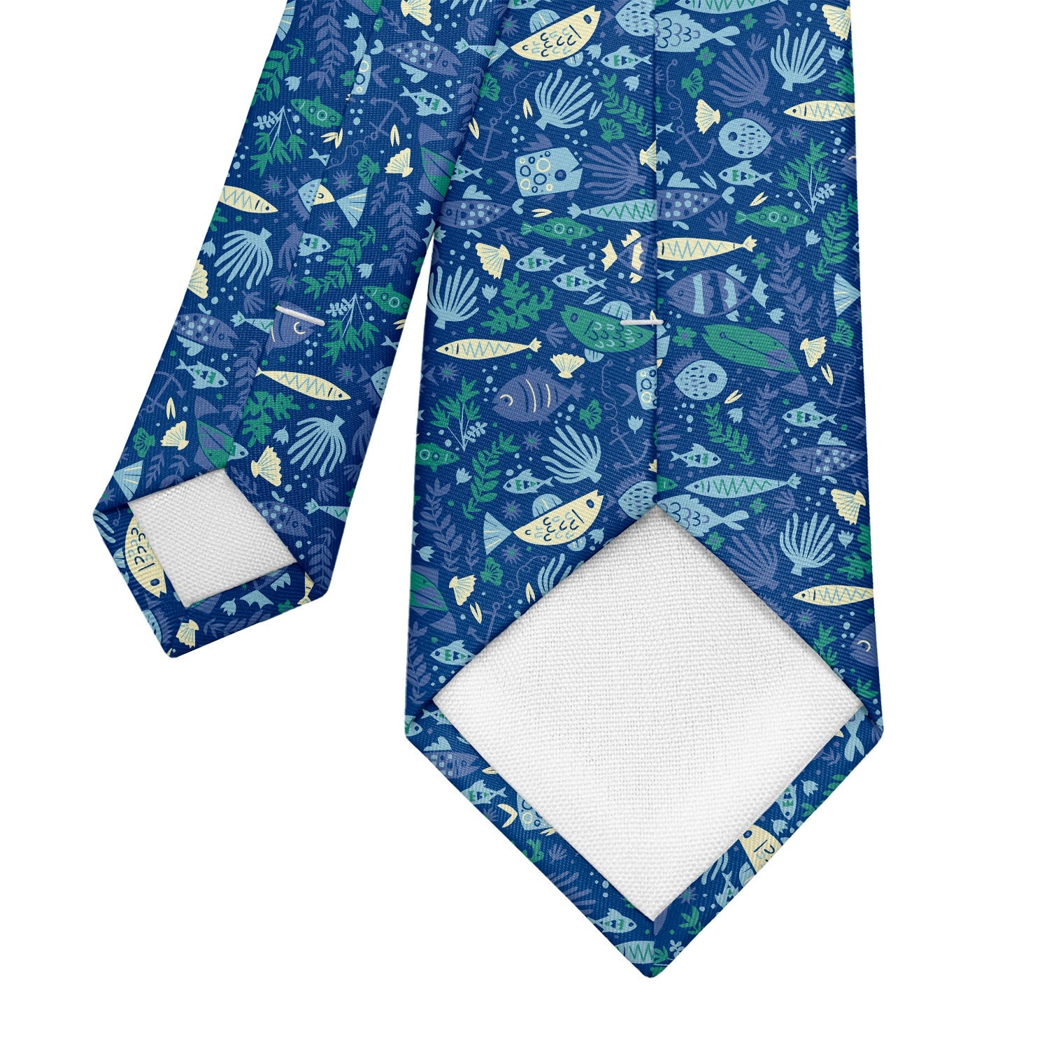 Playful geometric patterns and muted colors give our Below the Sea necktie serious style. The modern design of this fish tie features a seascape teeming with fish, anchors, coral, and seaweed.