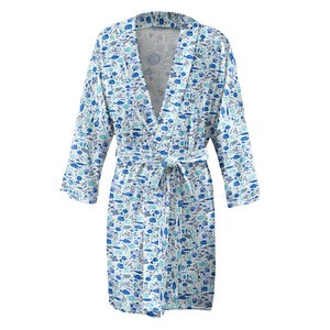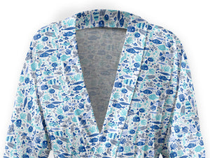 Playful geometric patterns and muted colors give our Below the Sea robe serious style. The modern design of this nautical robe features a seascape teeming with fish, anchors, coral, and seaweed.