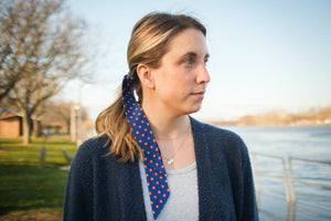 We use a high quality recycled polyester stretch poplin containing 86% recycled polyester, 14% spandex. Our hair scarves have a double-sided design with tapered ends.