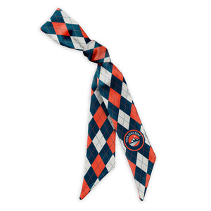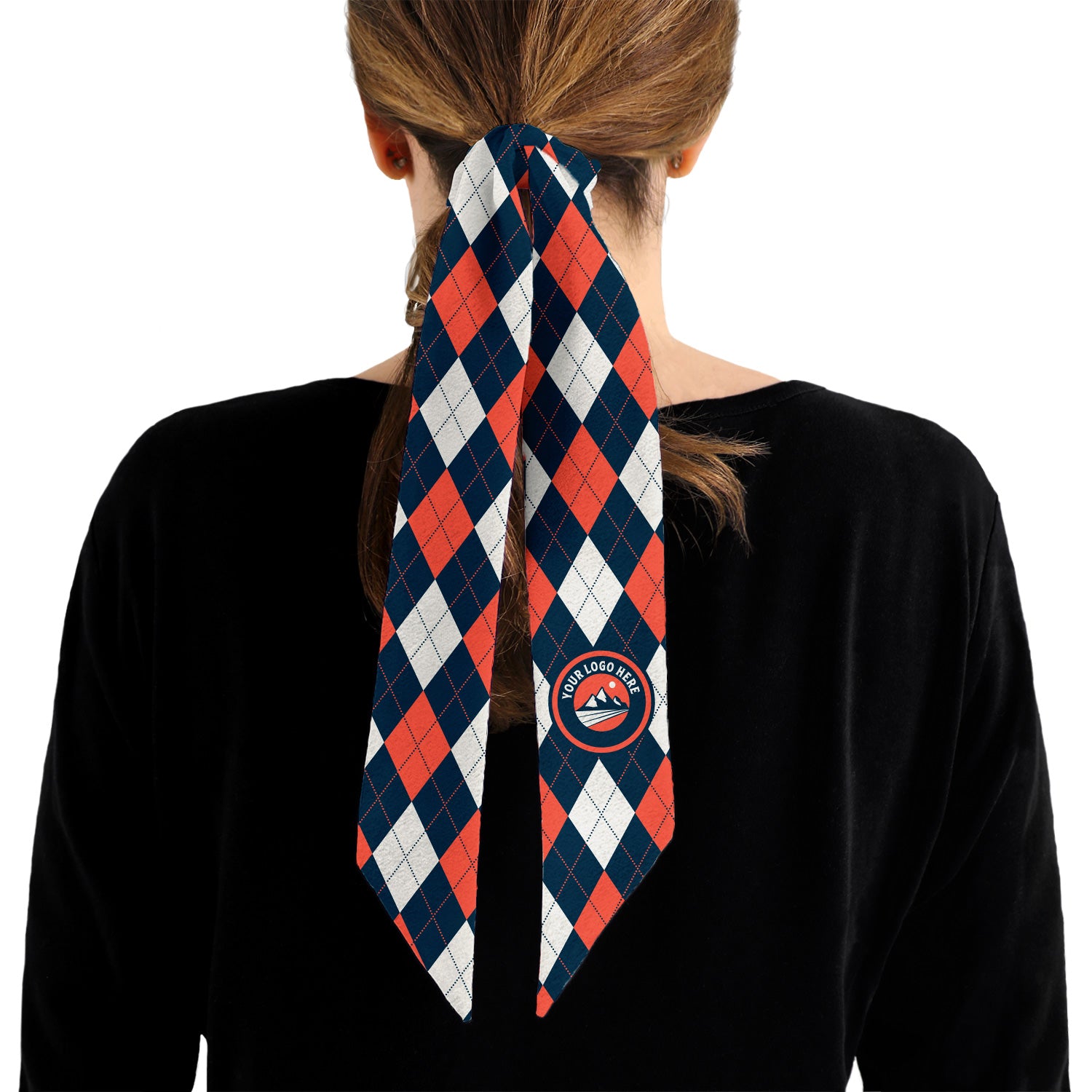 Feel confident that you can showcase your logo with class when you choose the Argyle 1 Custom Logo Hair Scarf. Our formal, three-color argyle pattern features your logo or graphic as a centered, single placement for maximum visibility no matter how the scarf is worn or tied. Believed to have originated in the 17th century, this plaid-like pattern is created by overlapping diagonal lines on solid diamonds, and symbolizes prestige and sophistication. The classy pattern can be customized in three colors that represent your branding or highlight the colors in your logo for a unique look specific to your industry and organization. Our incredibly versatile skinny scarves are made from premium recycled stretch poplin fabric that is silky soft yet structured and allows for outstanding double-sided printing and exceptional fade resistance.