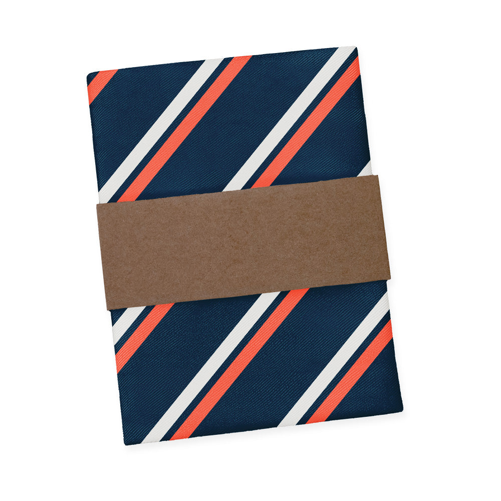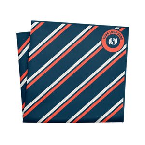 Meet one of our most popular patterns for those who appreciate timeless stripes: the Brooklyn 1 Custom Logo Pocket Square. This pattern features a classic 3-color stripe design, made up of two 0.2 inch wide parallel stripes separated by a thinner 0.1 inch stripe. We can customize each stripe in your brand’s colors, or in any color combination of your choice. Then, your logo will be placed proudly in the upper right corner, displaying your brand clearly and prominently. The Brooklyn 1 pattern works just as well for universities and schools as it does for corporations of all types. Made of a durable recycled fabric milled specifically for our pocket squares and printed with high quality dye sublimation printing, this wear and fade resistance fabric is perfect for long-lasting custom branded gifts or everyday uniforms.