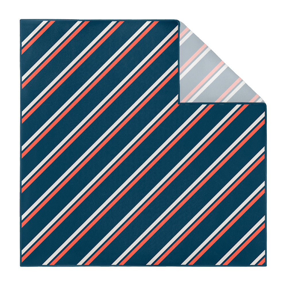 We print all our pocket squares on a recycled twill fabric made from plastic bottles that we have milled specifically for our products. We print our pocket squares on a single side and finish the edges with a fine purl edge. The back side of the pocket square will be unprinted.