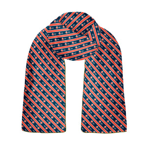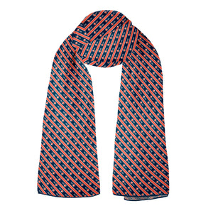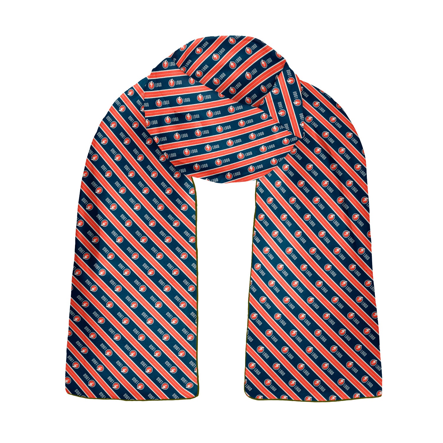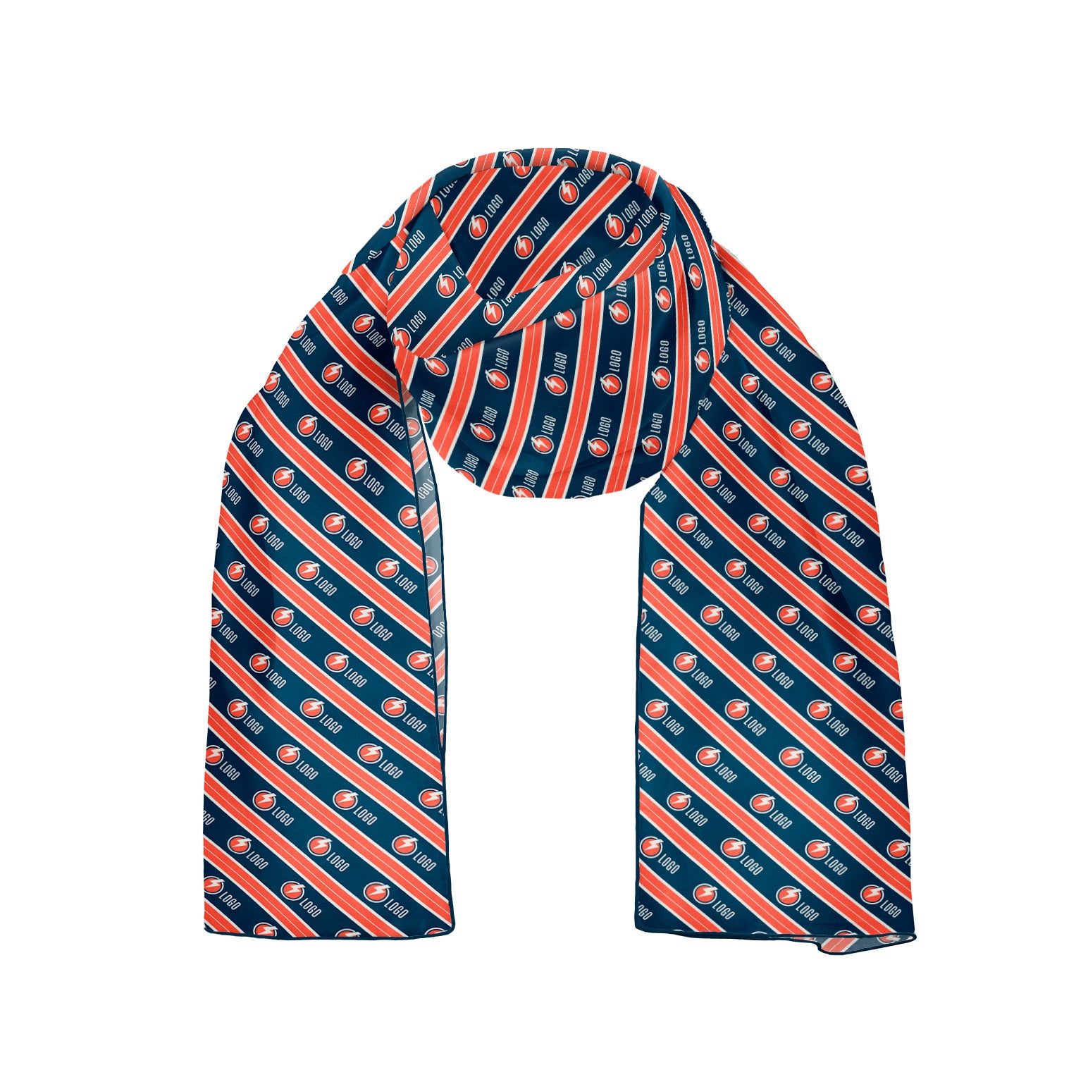 The perfect combination of a repeating logo pattern and a classic stripe, the Kalamath 2 Custom Logo Chiffon Scarf offers the best of both worlds. Featuring four stripes of differing widths, Kalamath 2 features your logo within the widest 0.9-inch diagonal stripe repeated all over the scarf. While this pattern works best for simpler logos due to the smaller scale of the logo placement, our advanced dye sublimation printing will provide the clearest one-sided print quality possible. Our non-fading, flowy and semi-transparent chiffon fabric and finely thread-wrapped edges makes our scarves durable enough for everyday use, and luxurious enough for a special gift. This timeless striped pattern works well for multiple sectors but is most popular with schools and universities.