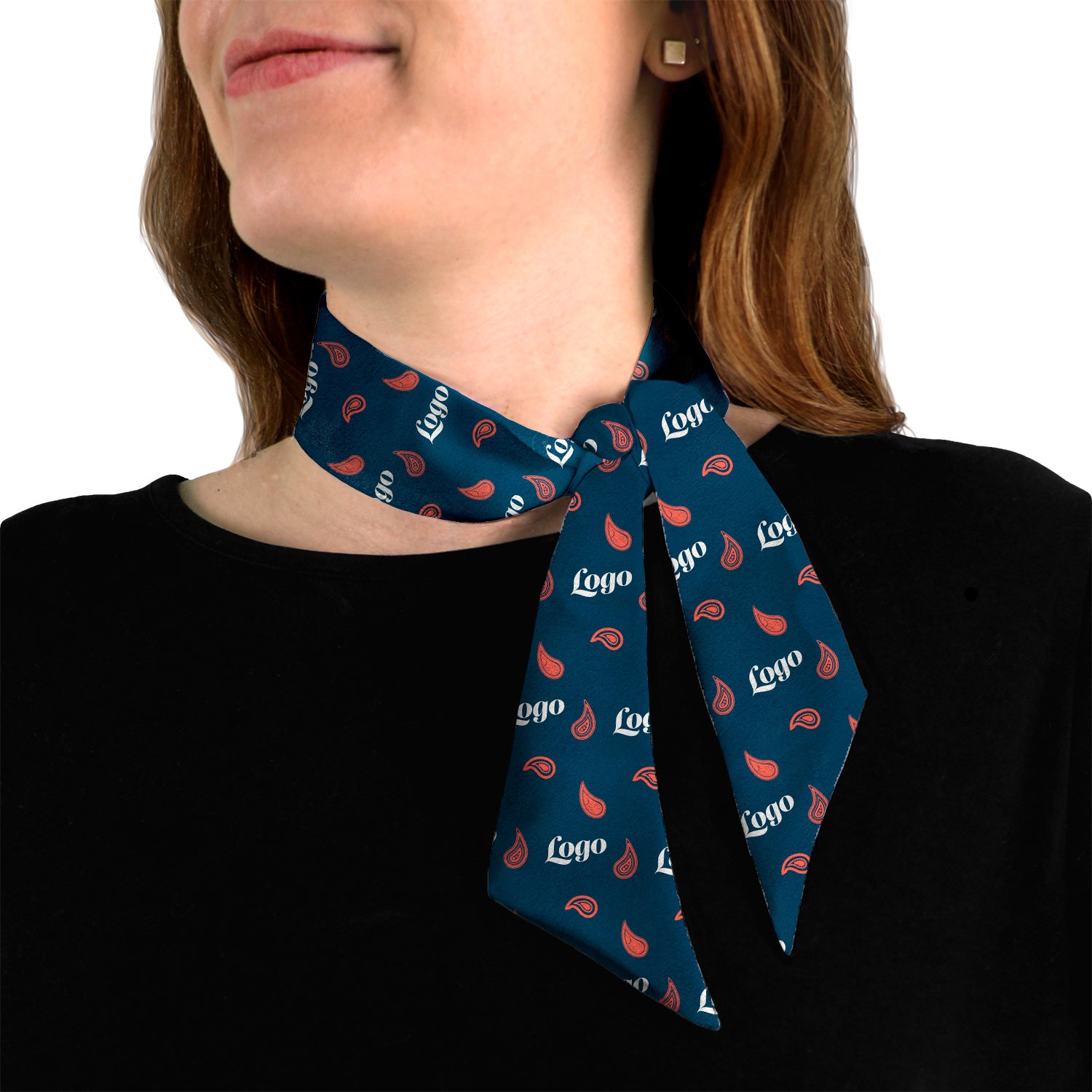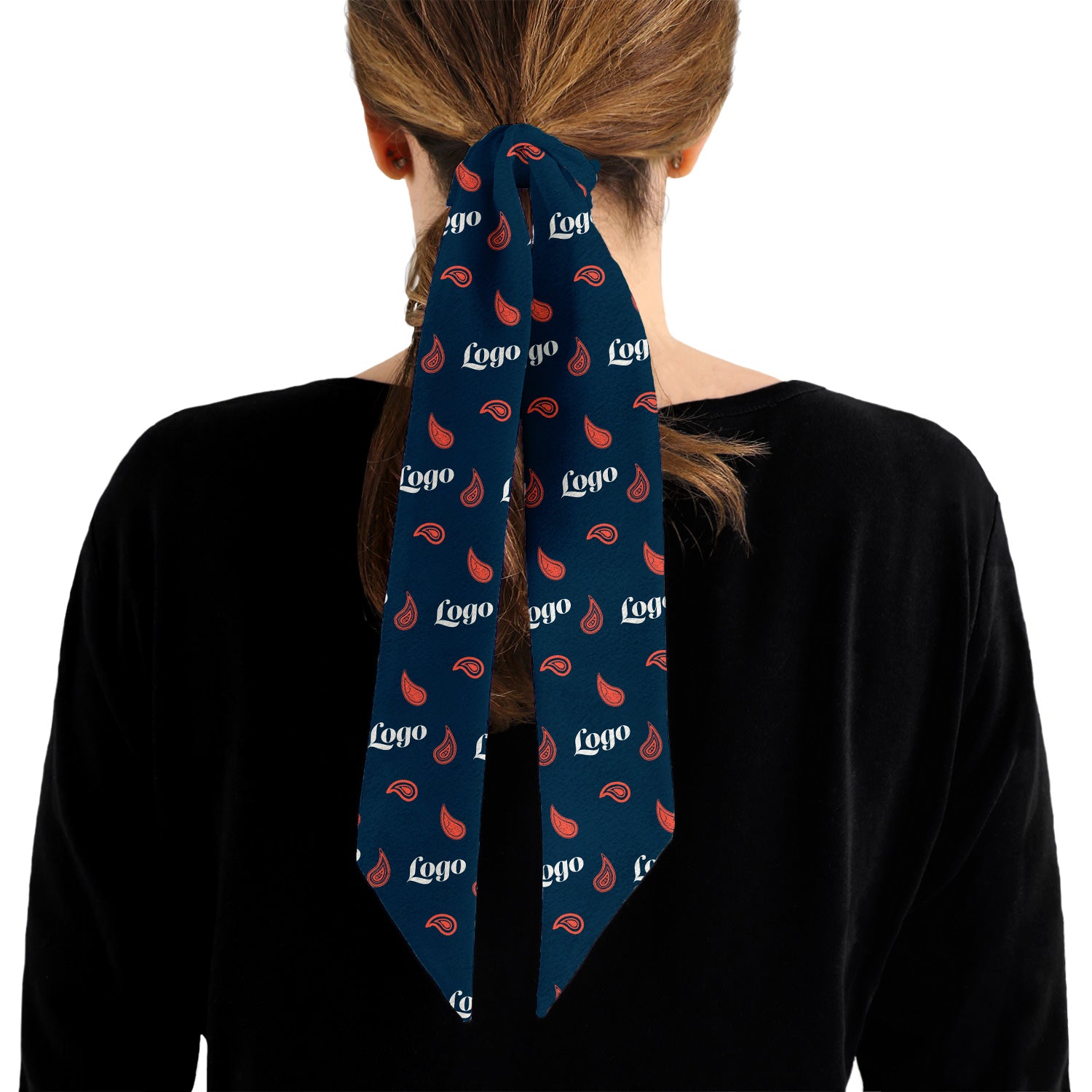 The Paisley 2 Custom Logo Hair Scarf playfully integrates your logo into a whimsical paisley pattern. This motif includes a repeating teardrop-shaped boteh pattern and showcases your logo over the entire length and width of this skinny scarf. Paisley is thought to have been created 2,000 years ago in the Middle East, and has been adopted into bohemian and art nouveau aesthetics over the years. With a rich and lengthy history, this pattern remains eye-catching and fashionable still today. Brands, institutions and organizations large and small looking for a lively design love this versatile product that can be worn as a hair accessory, around the neck or tied to a purse or briefcase. Our advanced manufacturing process uses our soft and supple recycled stretch poplin fabric in combination with modern dye sublimation techniques for exceptional results.