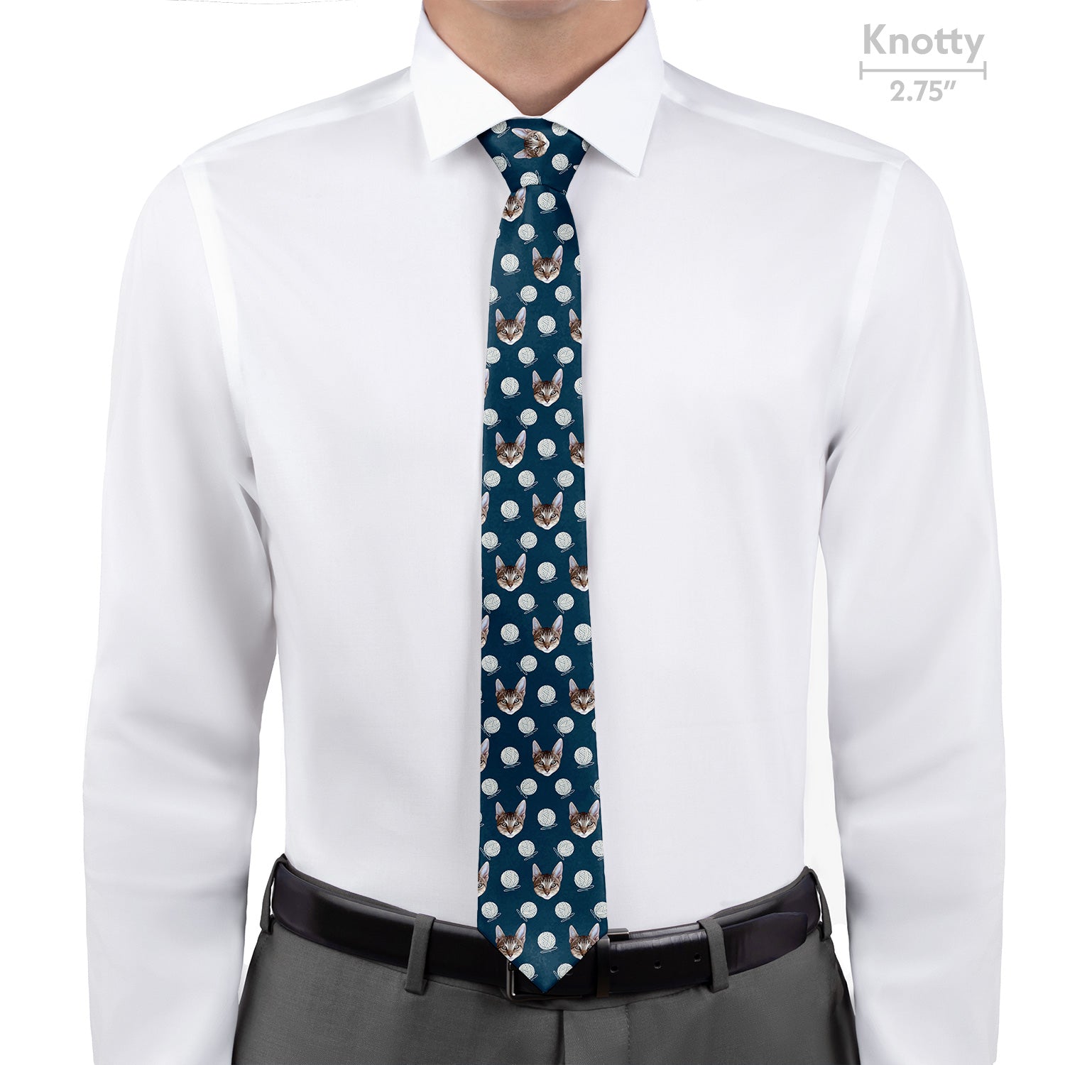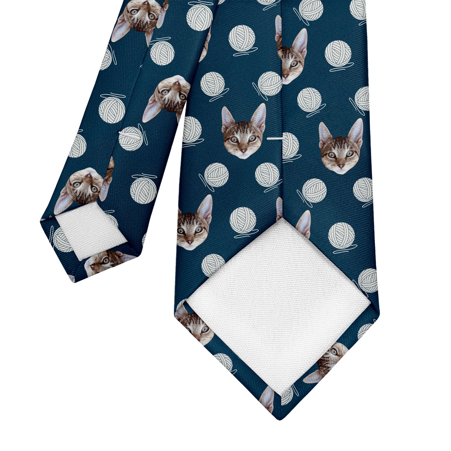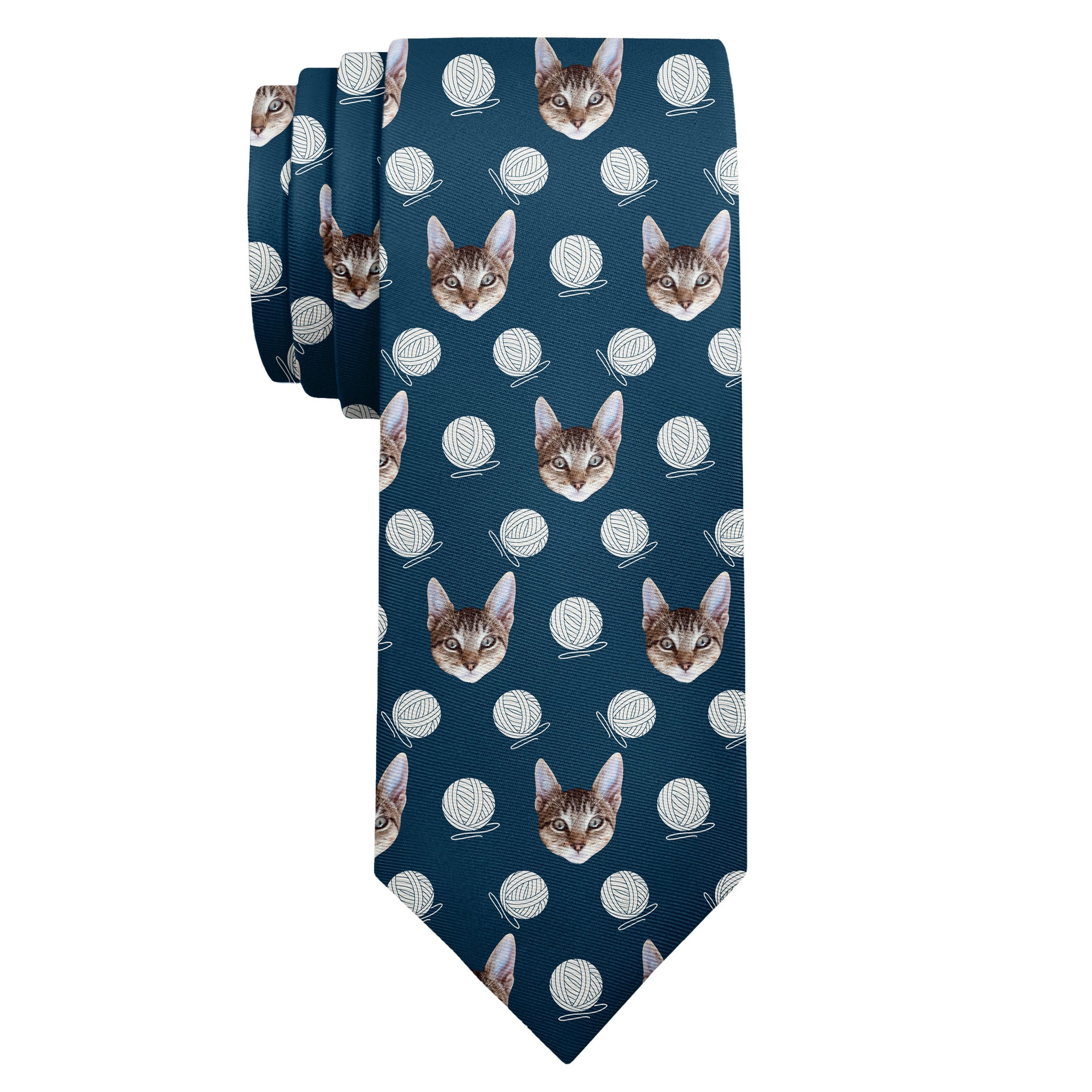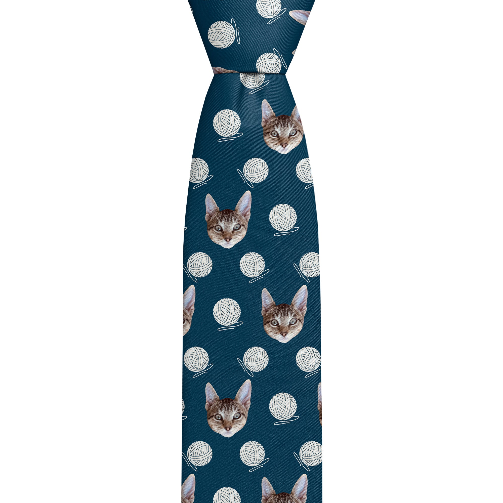 Don’t get tangled up in the hunt for the right cat necktie - our Yarn Custom Photo Necktie is purrfect for all cat lovers! This repeating pattern features your cat’s photo along with whimsical balls of yarn for a pattern as playful as your furry friend. We would recommend using a clear photo of your cat’s face or opt for a shot of their full body if you prefer. If you’d rather see the photo placed once on the center of the tie, we can design it that way instead of the repeating photo pattern - just let us know! Your exquisitely printed design will wrap around the tie fully for a polished, high-quality look and feel making our ties ideal for gifting.