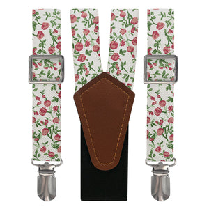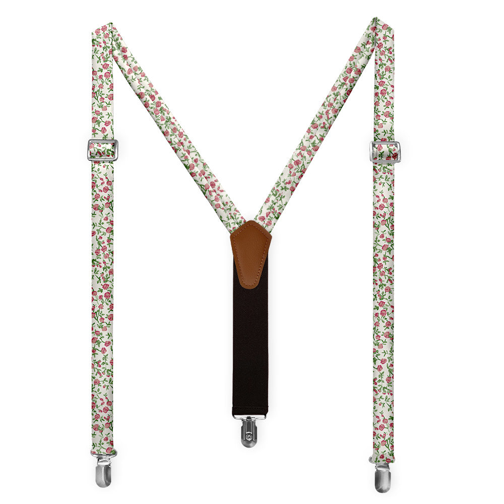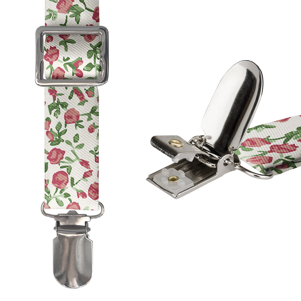 Printed fabric straps are 1-inch wide and secured to an elastic rear strap with vegan leather Y-back to allow the suspenders to move with you and extend as you bend. We use silver alligator pant clips that feature a special mechanism to ensure the suspenders clamp securely to pants.