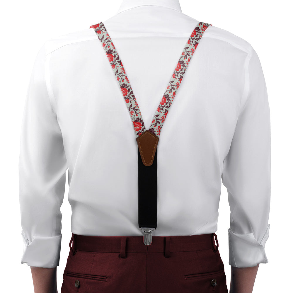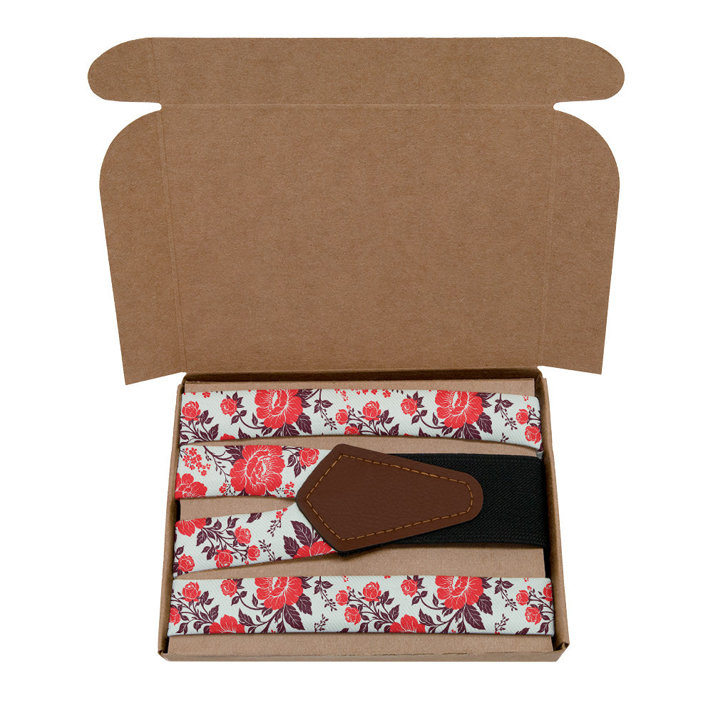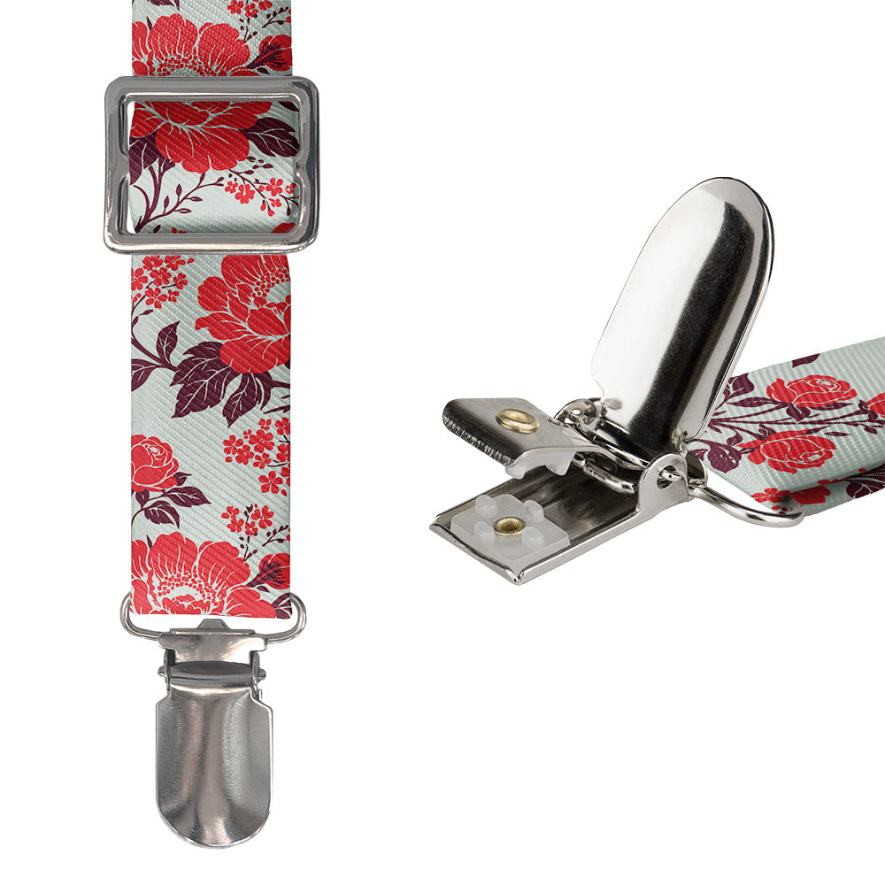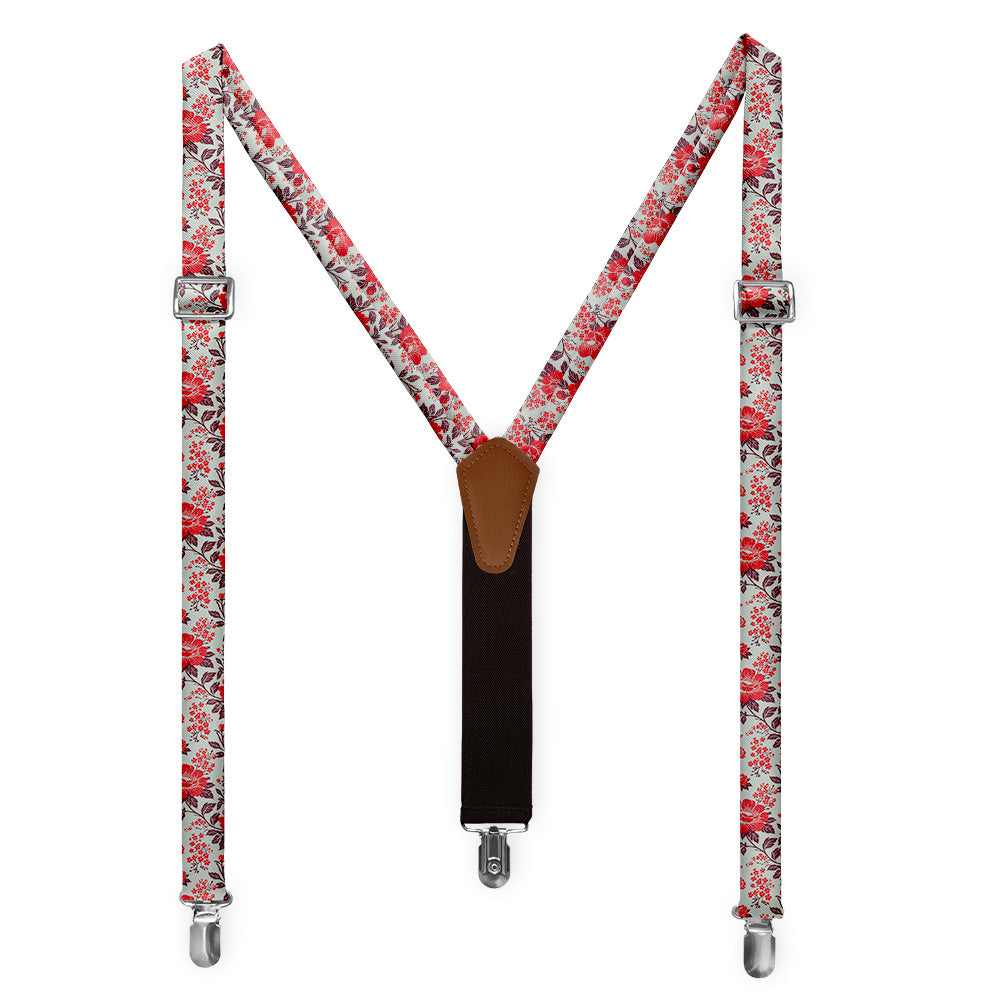 These Estate Garden Floral Suspenders showcase large blooming flowers connected by flowing stems, leaves, and delicate clustered blossoms in an organic botanical arrangement. Layered petals and branching elements create a continuous, intricate pattern across the suspender. Perfect for weddings, formal events, and refined everyday styling, this classic floral design adds timeless elegance to any outfit.