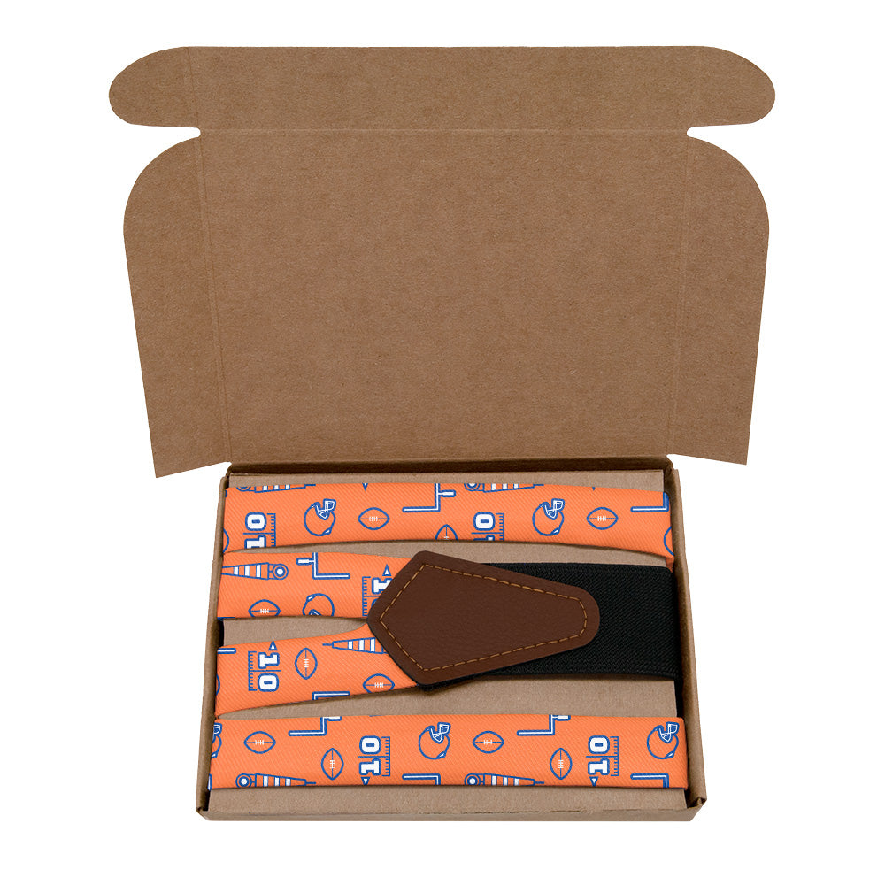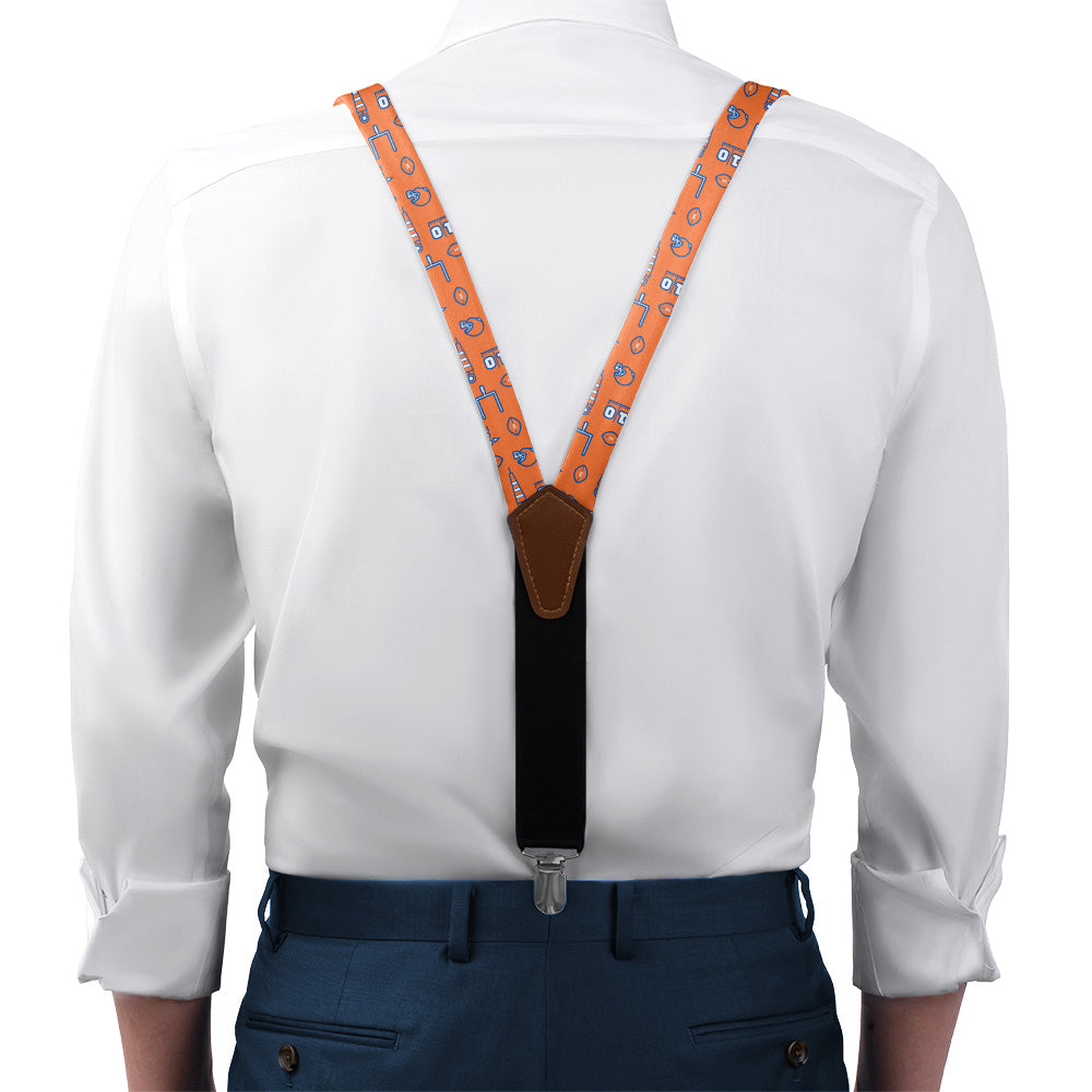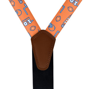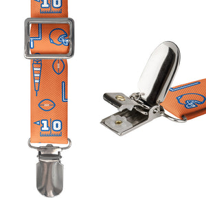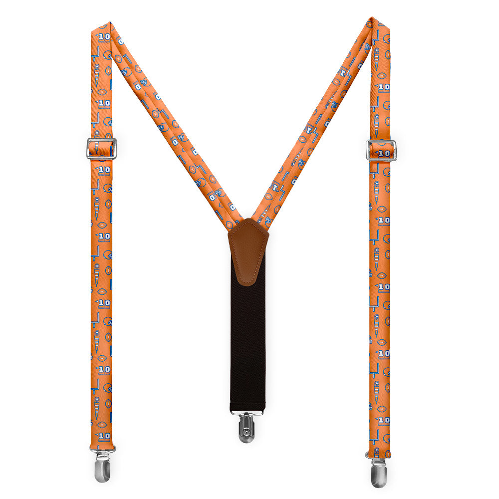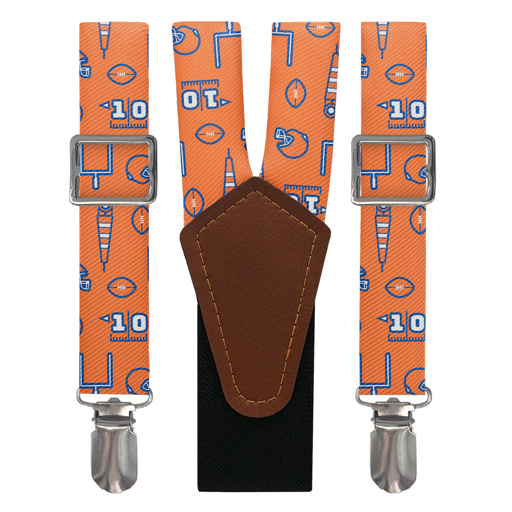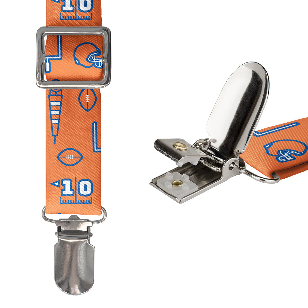 Elevate your game day look with our First Down Football Suspenders! This playful pair of suspenders features a repeating design that captures all the excitement of a football game - from field goals and first downs to helmets, footballs, and 10-yard lines. Personalize the pattern with your team's colors and let your spirit shine, whether you're rooting for high school, college, or NFL football teams.