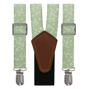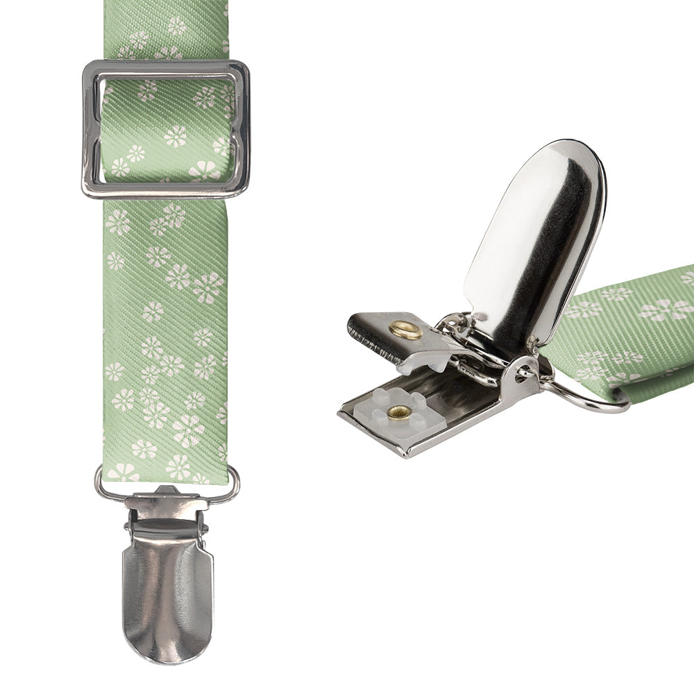 Printed fabric straps are 1-inch wide and secured to an elastic rear strap with vegan leather Y-back to allow the suspenders to move with you and extend as you bend. We use silver alligator pant clips that feature a special mechanism to ensure the suspenders clamp securely to pants.