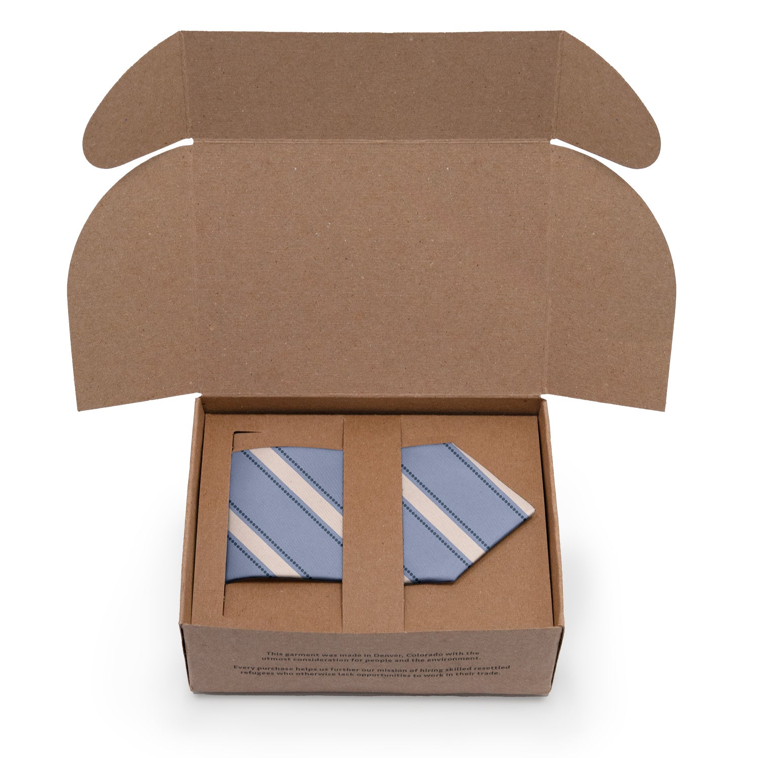 We print all our neckties on a high quality twill fabric made from recycled plastic bottles that we have milled specifically for our ties. Our recycled poly twill fabric has the soft sheen and feel of a semi-matte silk.