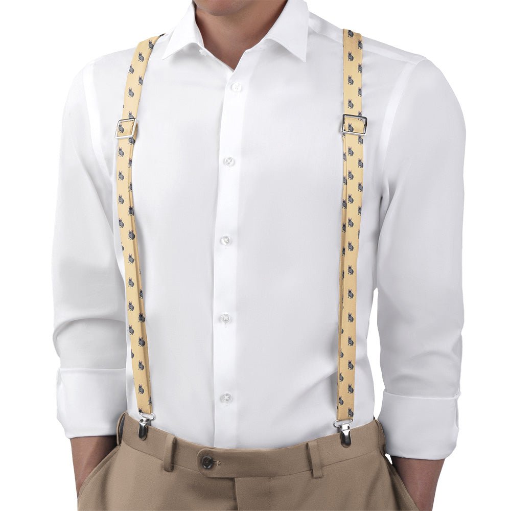 Printed fabric straps are 1-inch wide and secured to an elastic rear strap with vegan leather Y-back to allow the suspenders to move with you and extend as you bend. We use silver alligator pant clips that feature a special mechanism to ensure the suspenders clamp securely to pants.