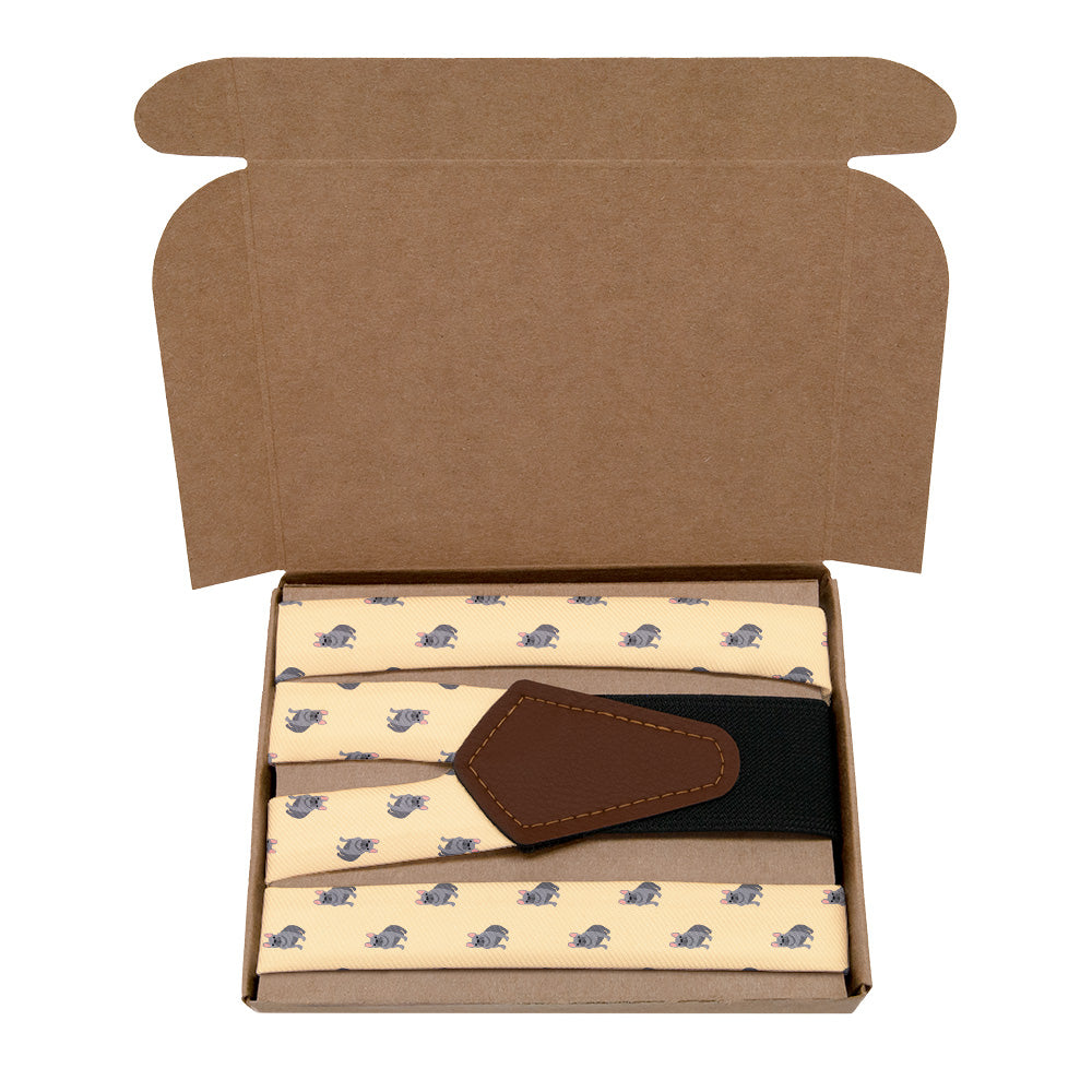 You can recognize a French Bulldog by its large, bat-like ears. The French Bulldog suspenders make a great gift for fans of these playful pooches.