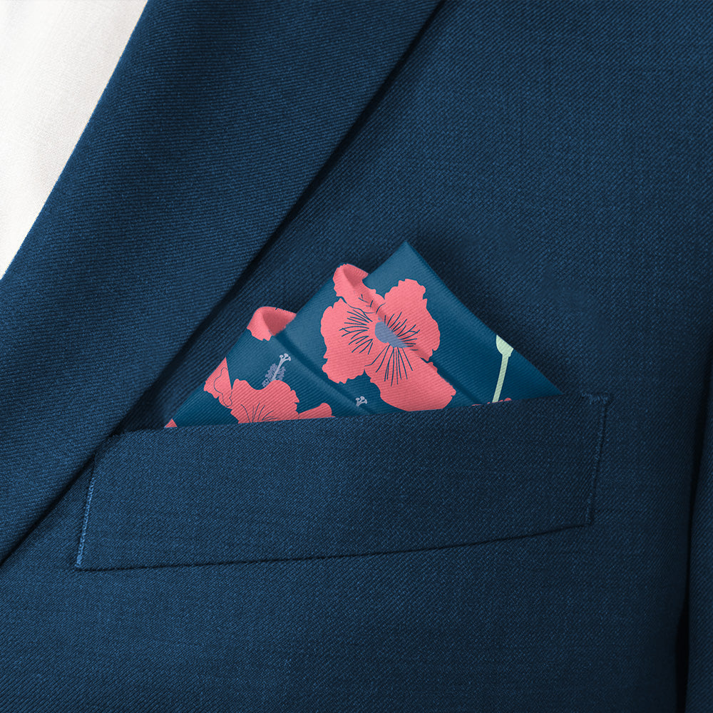 Bold hibiscus blossoms take center stage in this tropical pocket square. The Happy Hibiscus pocket square is a natural fit for a destination wedding or a night out in the heat of summer.
