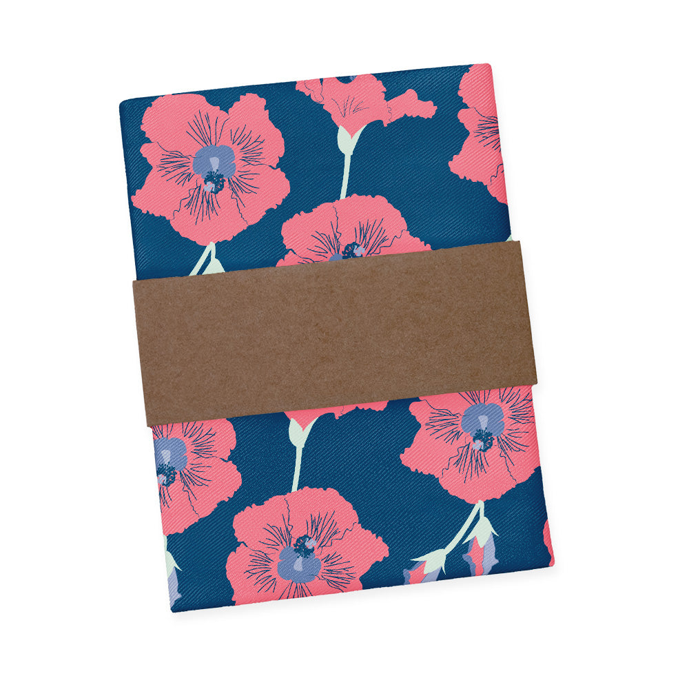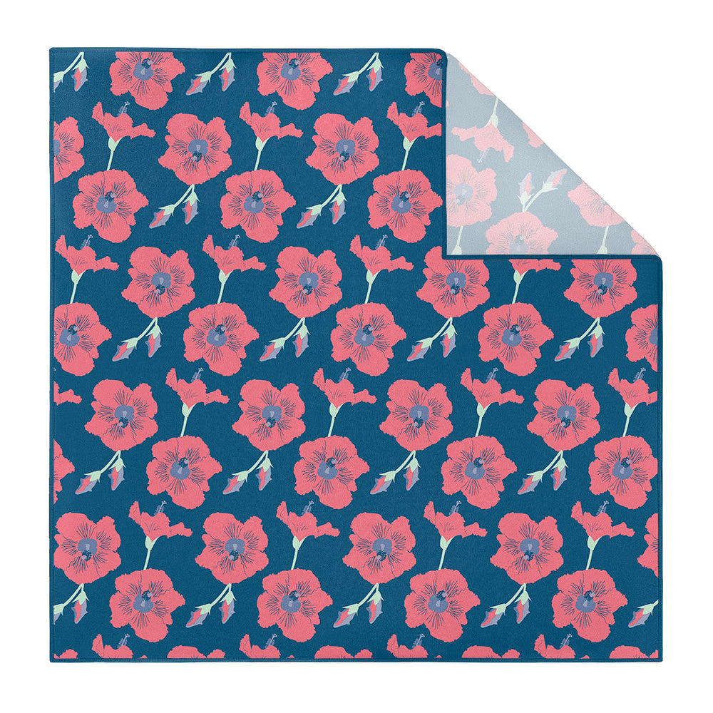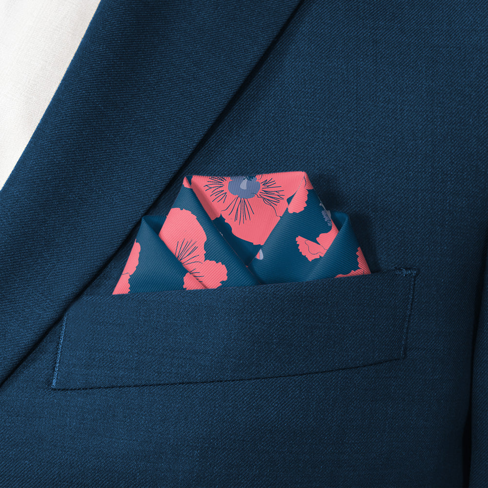 We print all our pocket squares on a recycled twill fabric made from plastic bottles that we have milled specifically for our products. We print our pocket squares on a single side and finish the edges with a fine purl edge. The back side of the pocket square will be unprinted.