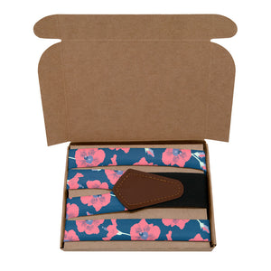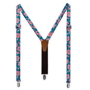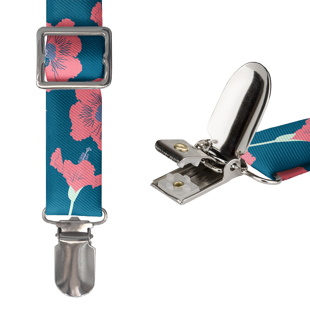 Printed fabric straps are 1-inch wide and secured to an elastic rear strap with vegan leather Y-back to allow the suspenders to move with you and extend as you bend. We use silver alligator pant clips that feature a special mechanism to ensure the suspenders clamp securely to pants.