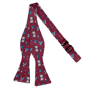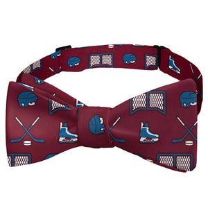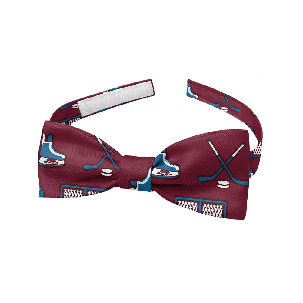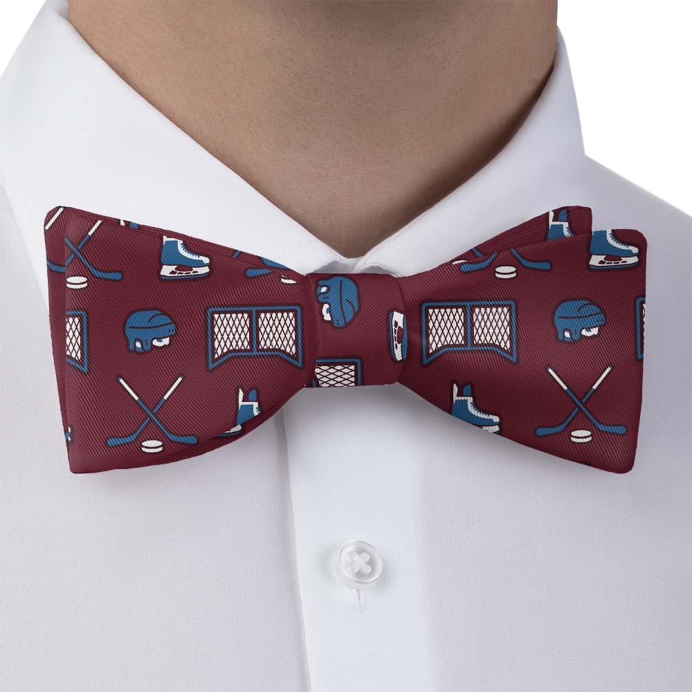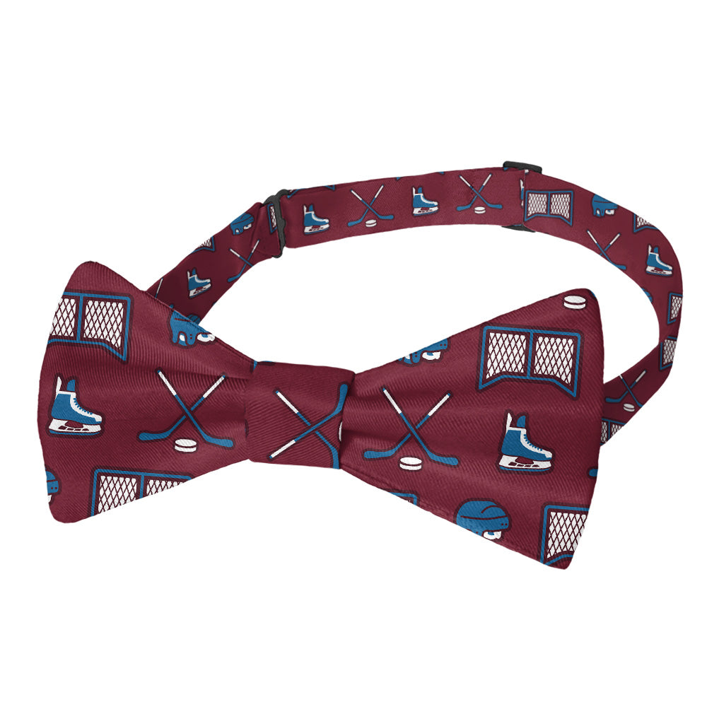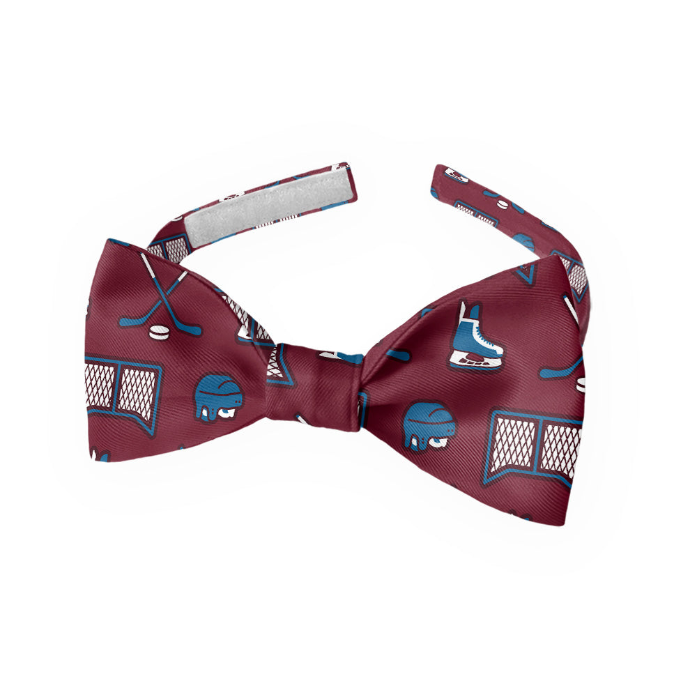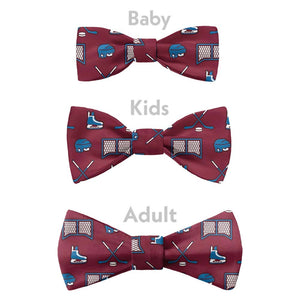 Celebrate your favorite sport with the Hat Trick Hockey Bow Tie! Featuring classic icons such as sticks, pucks, goals, helmets, and skates, this playful bow tie is a must-have for any hockey fan. Flaunt your passion for the sport with this one-of-a-kind accessory that can be easily customized in your team's colors.